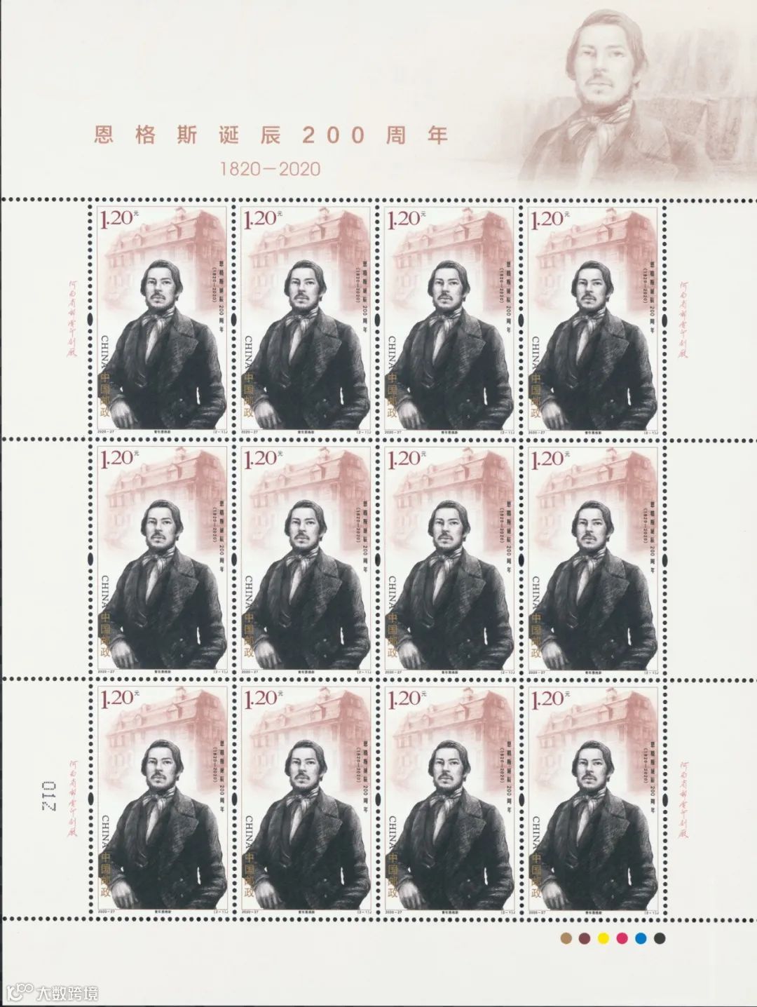 中国邮政定于2020年11月28日发行《恩格斯诞辰200周年》纪念邮票一套2枚。邮票图案名称分别为:青年恩格斯、工作中的恩格斯。全套邮票面值为2.40元。计划发行数量为750万套。