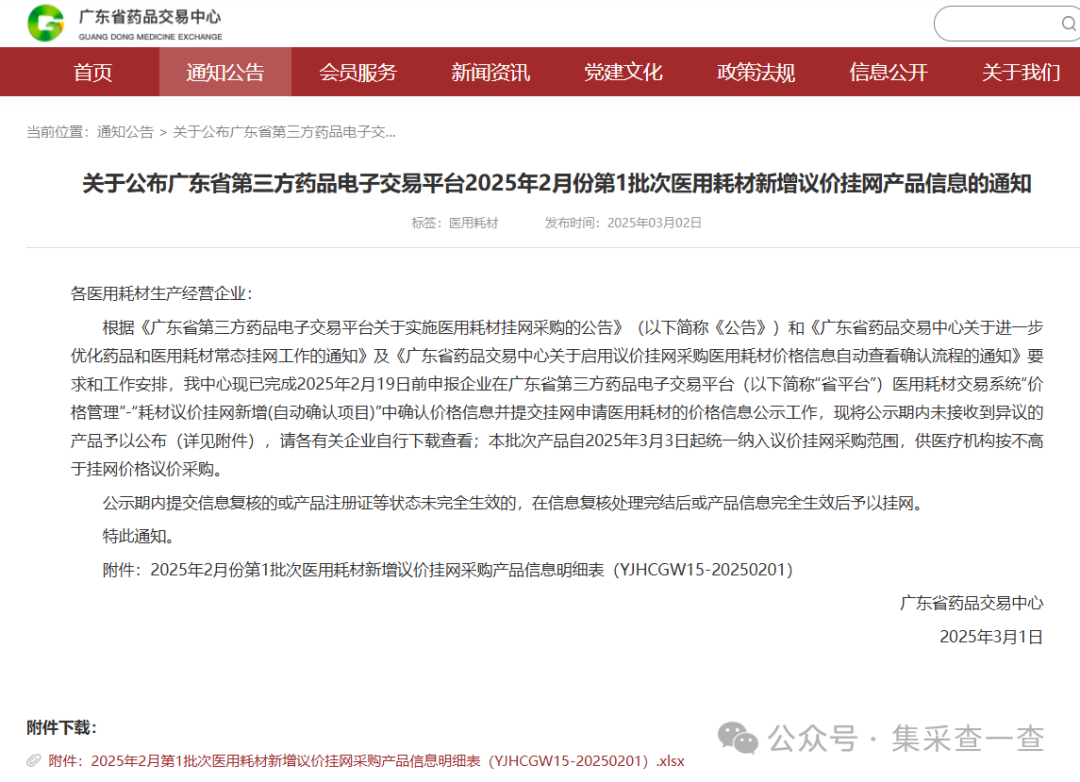 根据《广东省第三方药品电子交易平台关于实施医用耗材挂网采购的公告》(以下简称《公告》)和《广东省药品交易中心关于进一步优化药品和医用耗材常态挂网工作的通知》及《广东省药品交易中心关于启用议价挂网采购医用耗材价格信息自动查看确认流程的通知》要求和工作安排,我中心现已完成2025年2月19日前申报企业在广东省第三方药品电子交易平台(以下简称“省平台”)医用耗材交易系统“价格管理”-“耗材议价挂网新增(自动确认项目)”中确认价格信息并提交挂网申请医用耗材的价格信息公示工作,现将公示期内未接收到异议的产品予以公布(详见附件),请各有关企业自行下载查看;本批次产品自2025年3月3日起统一纳入议价挂网采购范围,供医疗机构按不高于挂网价格议价采购。