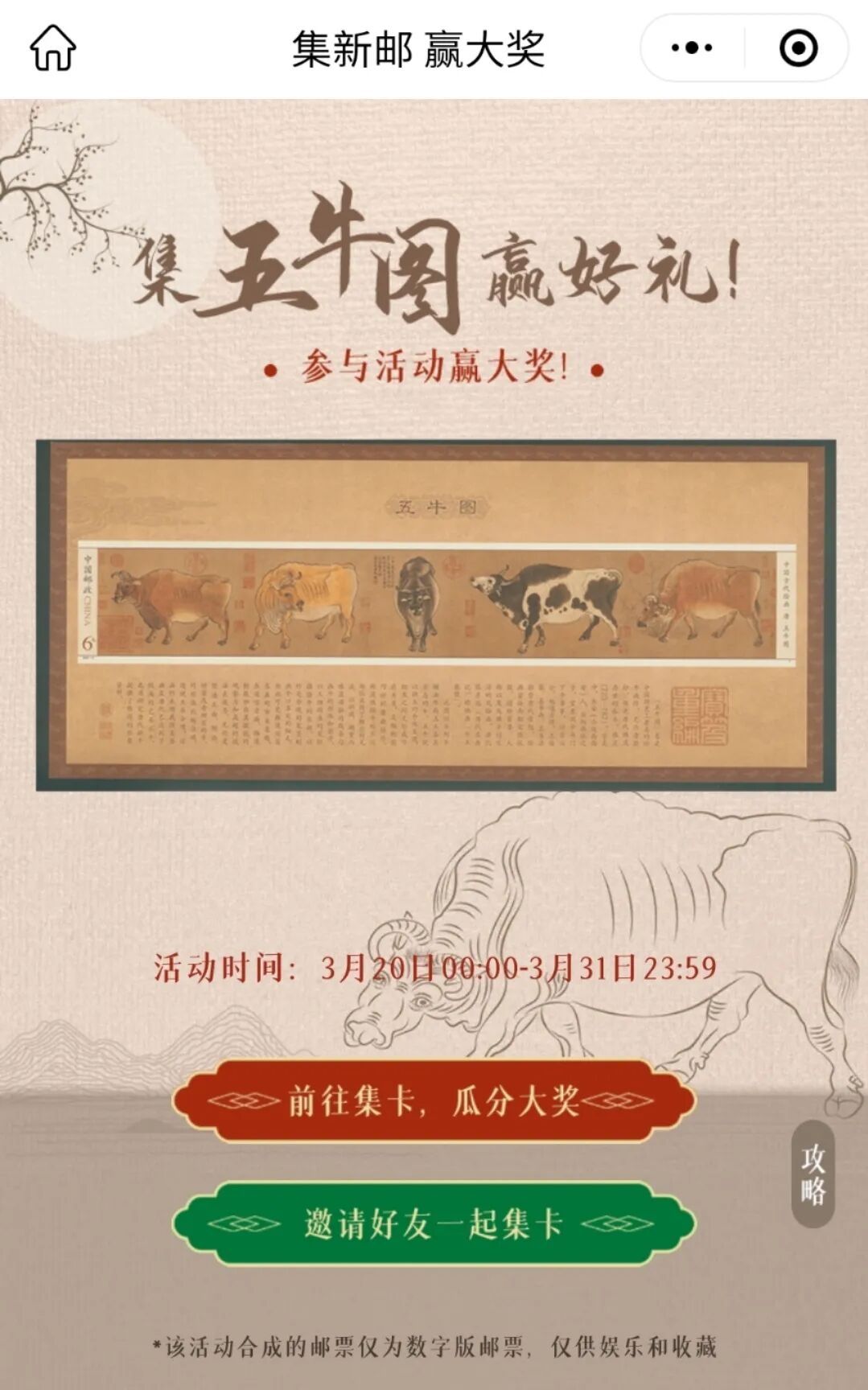 中国邮政定于2021年3月20日发行《五牛图》特种邮票(点击查看“发行通告”),还同步推出一系列好玩有趣、惊喜连连的邮票数字化互动活动,参与就有机会赢取好礼!