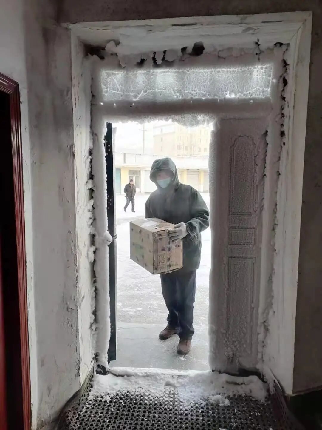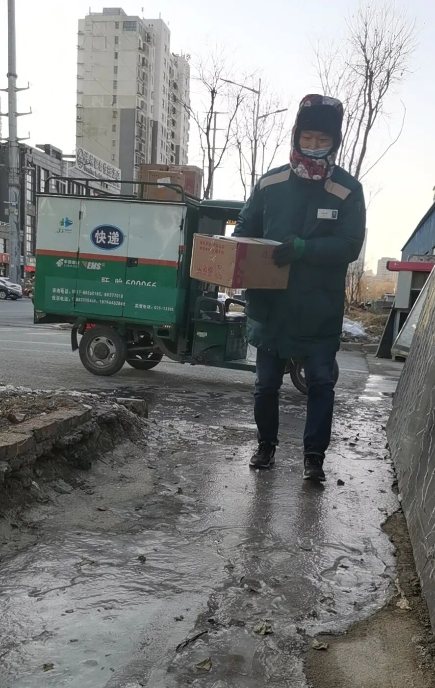 江苏盱眙投递员刘敬奕正小心翼翼地走在结冰的道路上,他棉袄、棉裤、棉鞋全副武装,脸被冻得通红。