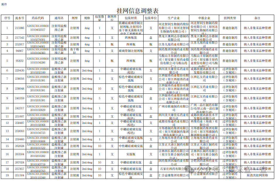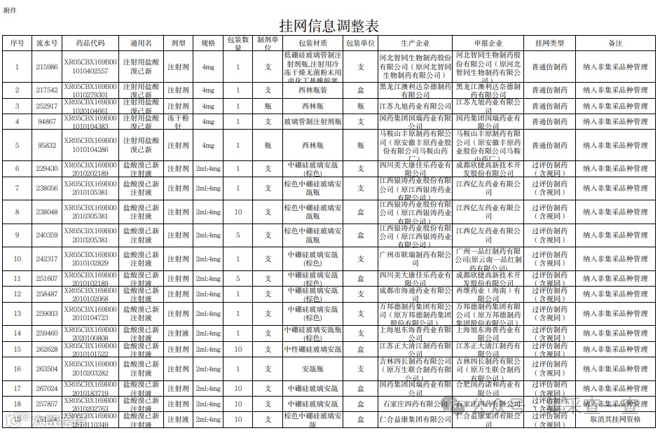现对上述涉及的在我省挂网的溴己新注射剂药品挂网信息进行动态调整,详见附件。