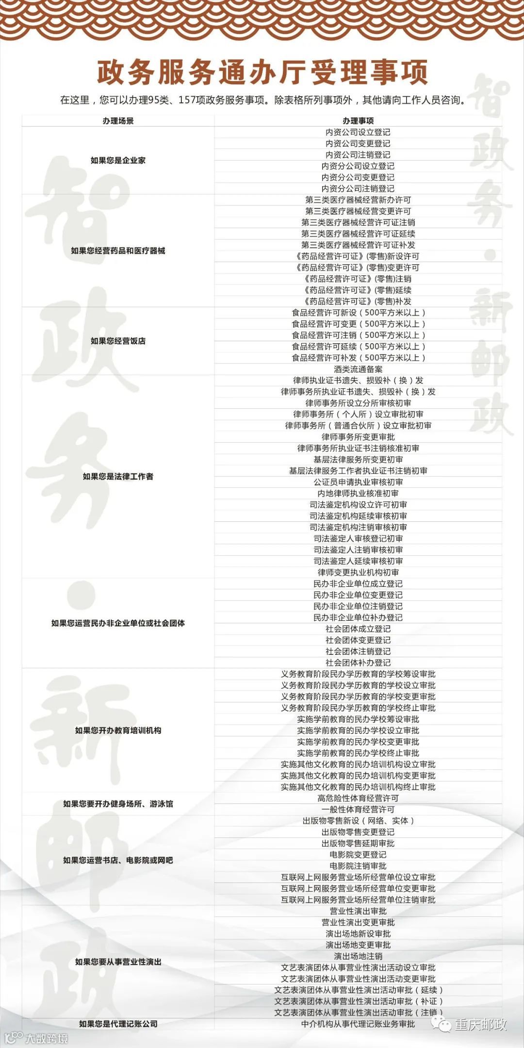重庆巴南区在邮政网点设立政务服务厅、政务服务点,为企业和群众代办行政审批、公共服务等事项。6月5日,在小辣椒主题邮局,江北区政务服务管理办公室与江北邮政联手打造的“智政务·新邮政”政务服务通办厅正式投用。6月17日上午,江津区政务服务管理办公室与江津邮政签订“政务+银行”“政务+邮政”战略合作协议。在潼南区,还成立了邮政便民通服务平台,水电气、通信话费、公交卡充值、公共事业费等生活缴费一站解决。