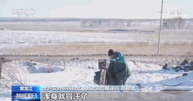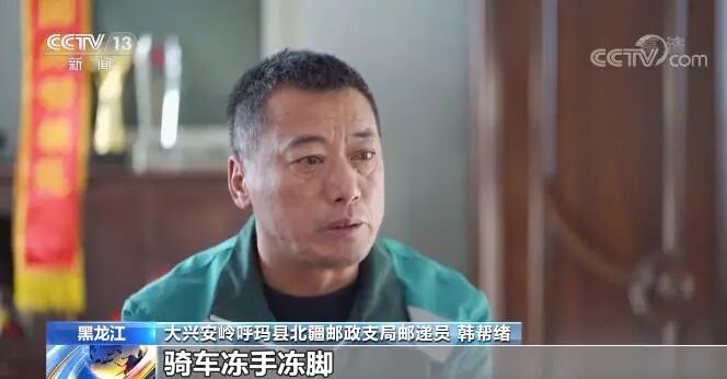 大兴安岭呼玛县北疆邮政支局邮递员韩帮绪:一出门就打透了,浑身哇凉哇凉的。骑车冻手冻脚,我就推车子跑,跑热乎了再骑,骑了十多里地,浑身就冒汗了。后背就全是湿的,晚上回家后背就一层硬壳。