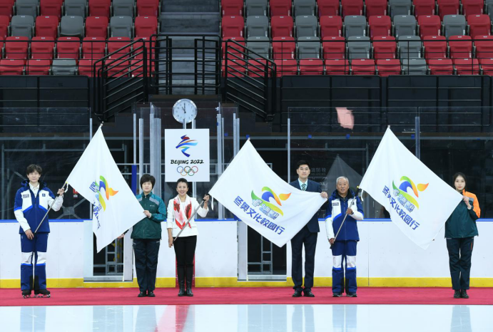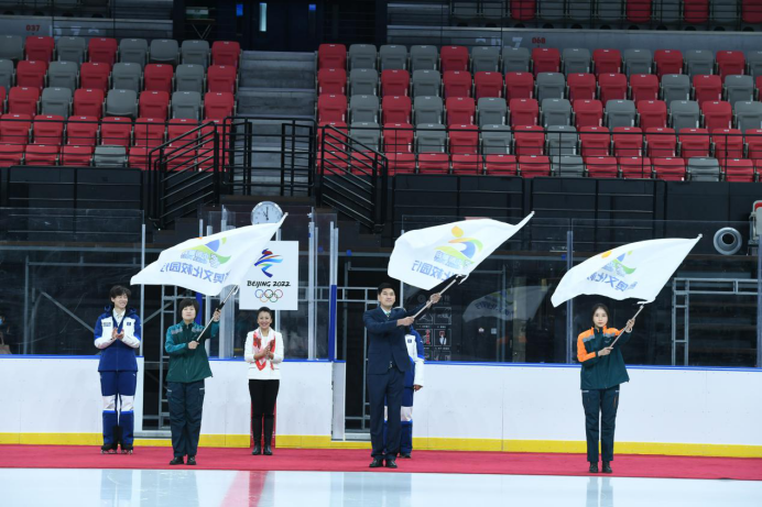 冬奥旗手赵伟昌、杨扬、佟健共同向邮政冬奥文化服务队代表授旗,正式启动“中国邮政冬奥文化校园行”活动。
