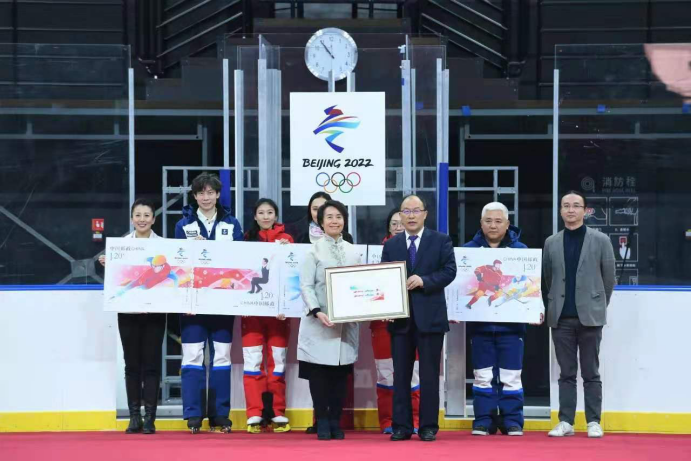 中国邮政集团有限公司副总经理康宁向北京冬奥组委赠送编号为2022A的《北京2020年冬奥会——冰上运动》纪念邮票版式二