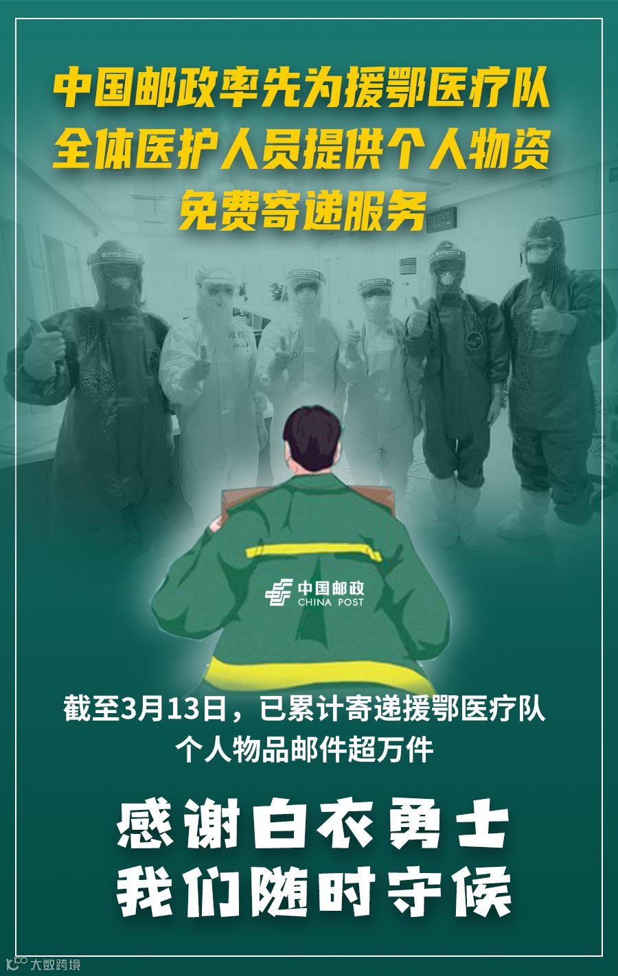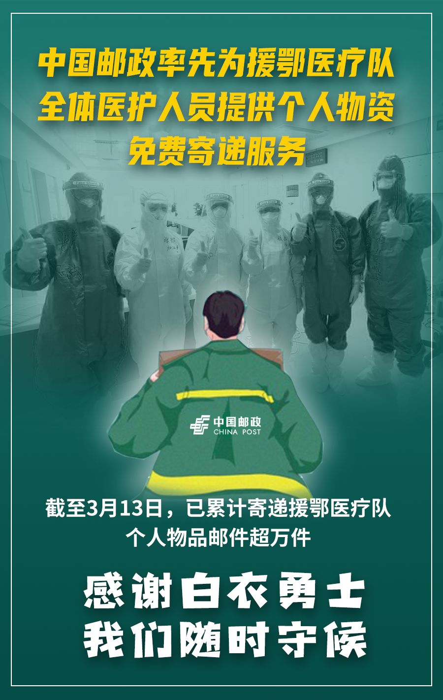 据悉,自3月2日起,中国邮政集团有限公司湖北省分公司就发布了在全省邮政开展援鄂医护人员个人物资免费寄递的通知,并对收寄邮件逐一跟踪流程,实时监控省内运输环节,统一指挥调度,及时处理异常情况,确保援鄂医护人员个人物资邮件第一时间收寄,最快时间运输,优先投递送达。截至3月13日,湖北省邮政分公司已累计收寄援鄂医疗队个人物品邮件1.13万件。