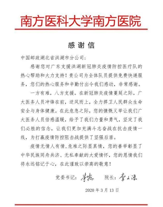 “感谢您对广东支援洪湖新冠肺炎疫情防控医疗队的热心帮助和大力支持!贵公司为全体队员提供免费快递服务,您们的热心服务和辛勤付出令我们感动,非常感谢。”3月13日,湖北省洪湖市邮政分公司收到了来自南方医科大学南方医院发来的感谢信,近日,他们为广东援鄂医疗队队员们免费收寄了个人物资254件,让医疗队队员们能够轻松平安回家。