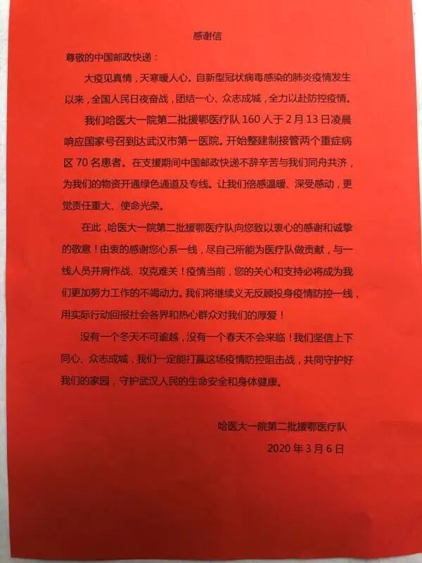 3月6日,哈医大一院第二批援鄂医疗队为免费寄递个人物资服务向武汉邮政发来感谢信;3月11日,唐山、承德、张家口支援湖北医疗队111名医护人员通过“武汉交通”微信公众号发表了“致敬邮政速递人员”的文章,对武汉邮政的服务表示感谢。