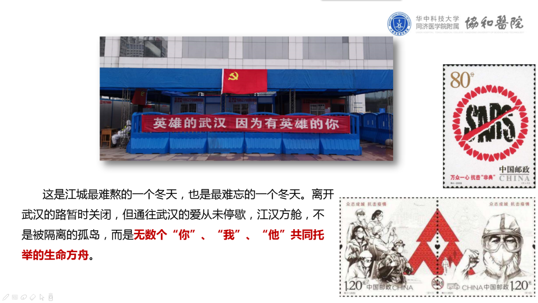 课件中,以《众志成城 抗击疫情》纪念邮票为代表的一系列邮票、明信片、纪念戳等元素吸引了全体参会党员的目光。孙晖书记以他收集的邮品生动展现了在党中央领导下,全国上下凝聚起众志成城的强大力量抗击疫情。特别是讲述了邮票作为“国家名片”,对此次疫情防控阻击战的特殊记录,更向社会各界传递了温暖与力量的重要意义。