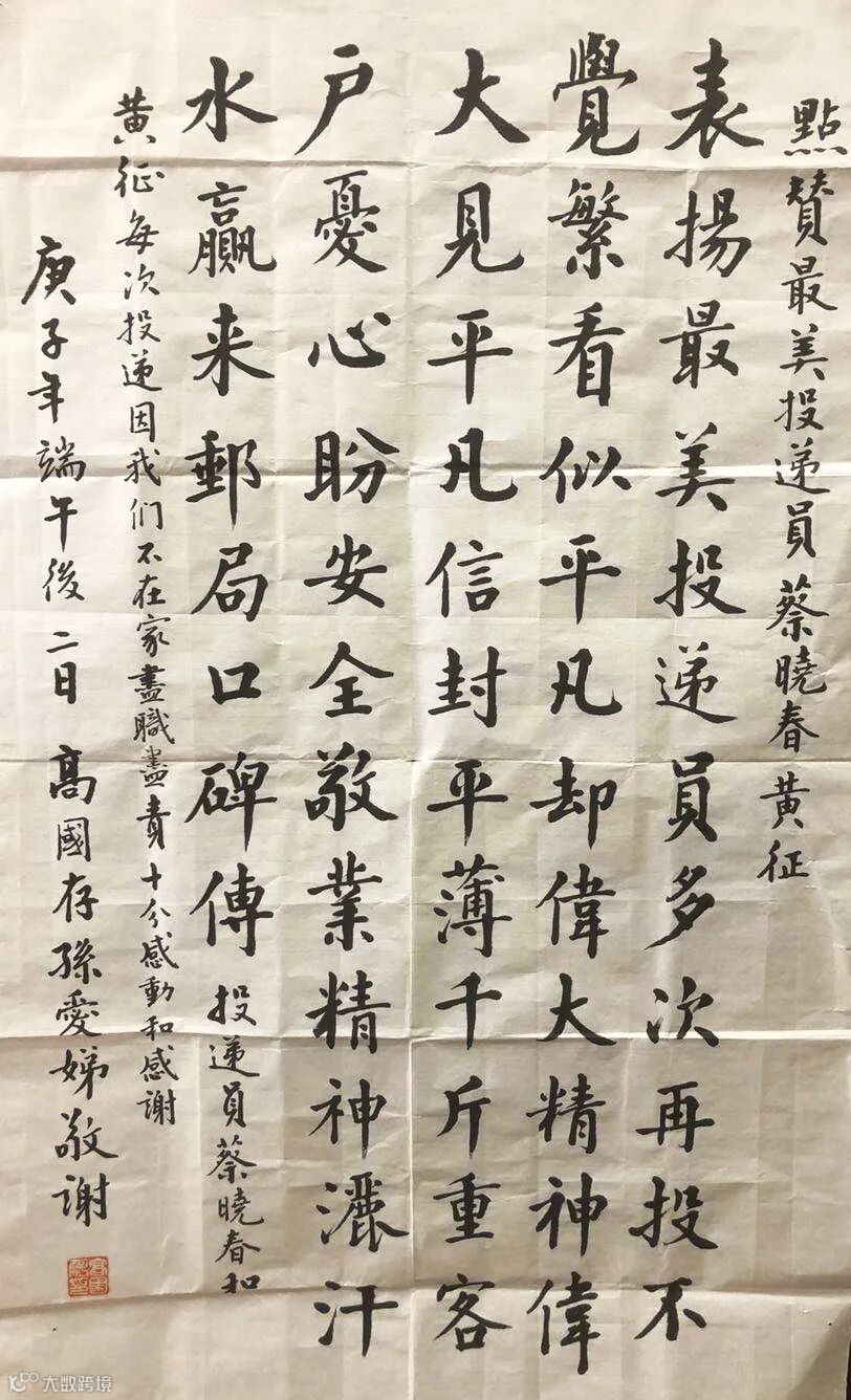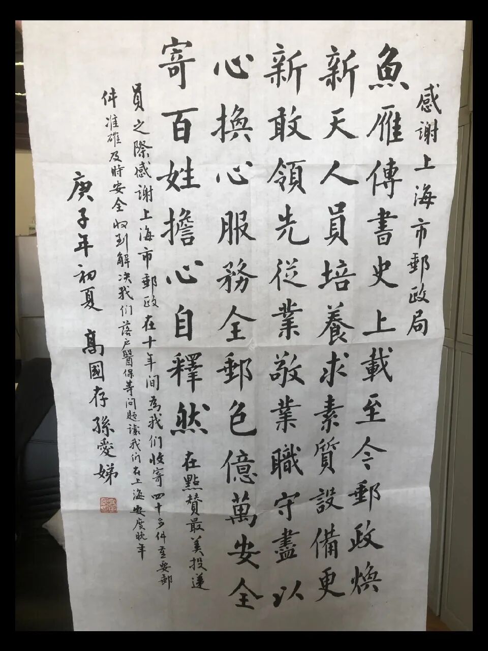 感激之情在心间,高老伯接连给上海邮政送来了两封手书“感谢信”:“信封平薄千斤重,客户忧心盼安全。敬业精神洒汗水,赢来邮局口碑传。”