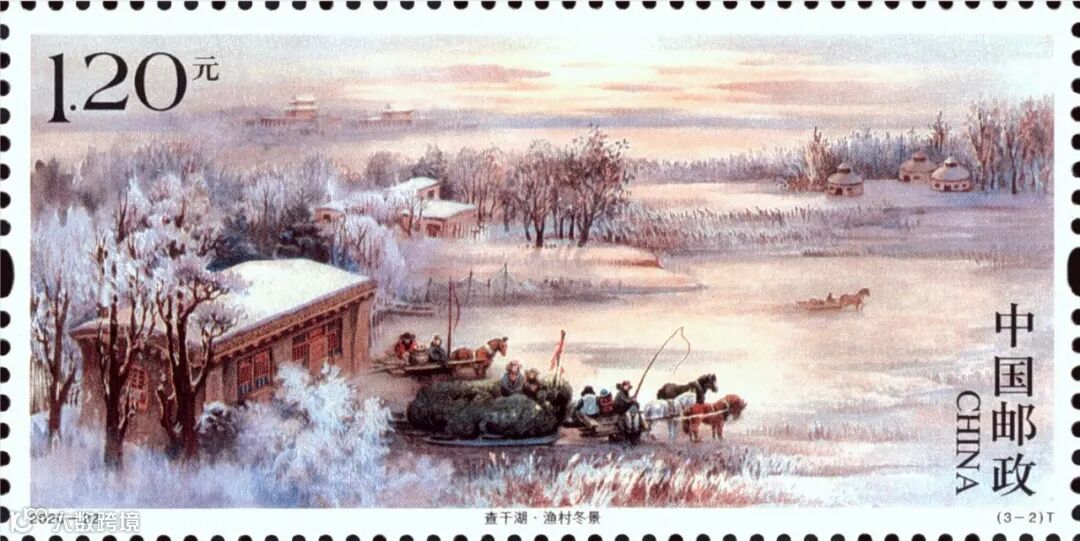 第二枚“渔村冬景”,画面表现了冬季查干湖畔为冬捕做准备忙碌的渔民身影。白雪皑皑的大地、高挂的雾凇、乡村屋舍和渔民共同构成了查干湖特有的渔猎生活景象。