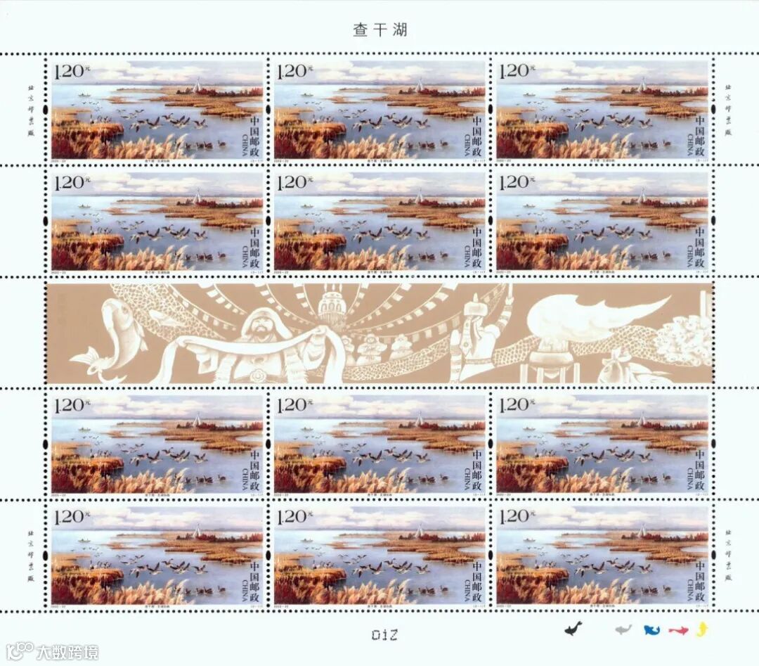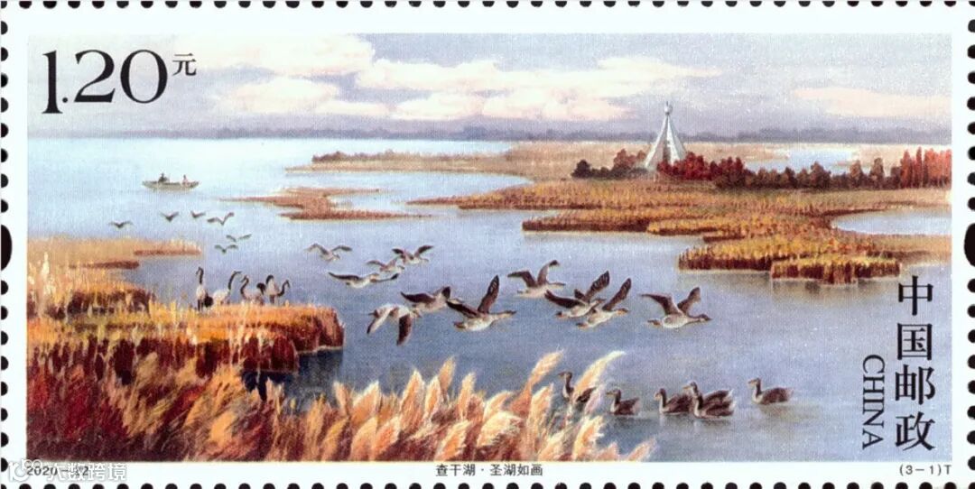 第一枚“圣湖如画”,画面表现了秋季查干湖碧波荡漾、芦苇摇曳、水鸟翔集的静谧壮美的景色。远处为查干湖畔的引松工程纪念碑。