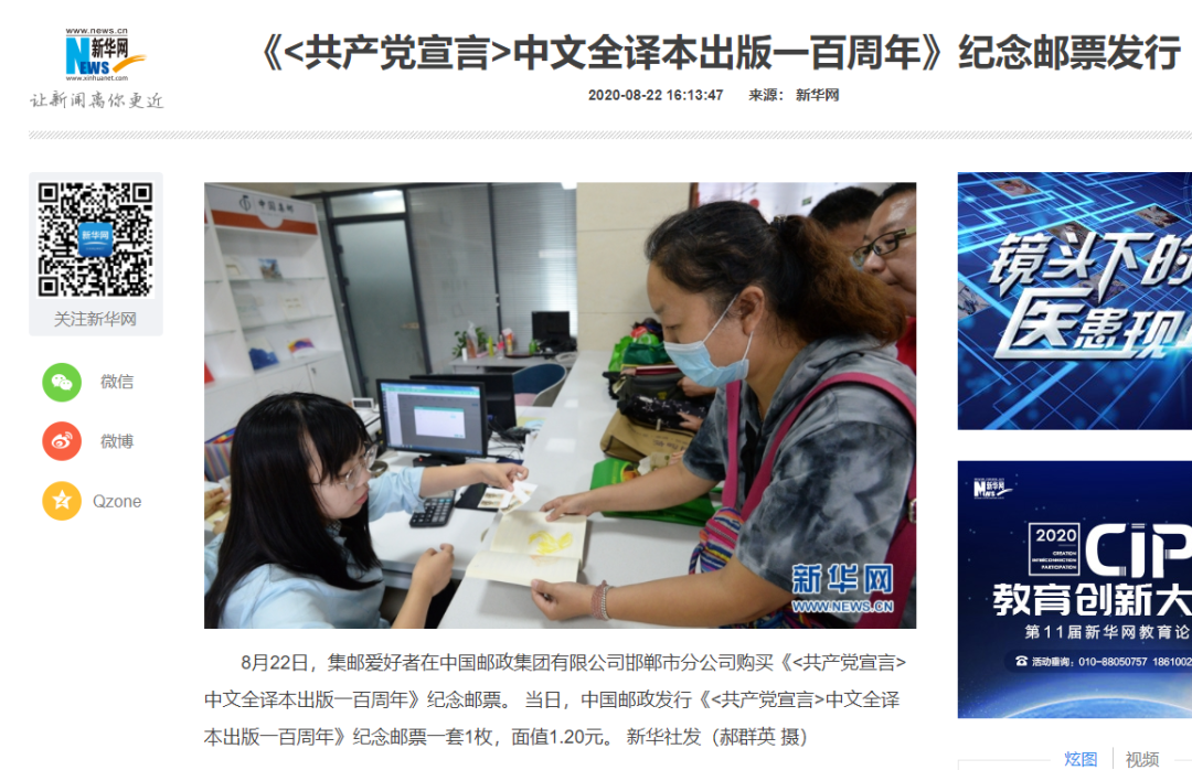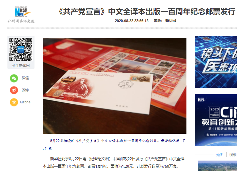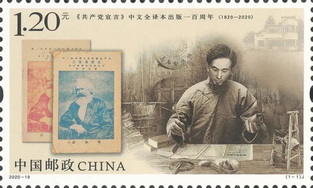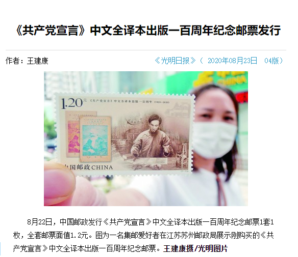 8月22日,中国邮政发行《<共产党宣言>中文全译本出版一百周年》纪念邮票,邮票一套1枚。图案名称为:《共产党宣言》中文全译本出版一百周年,邮票面值为1.20元。计划发行数量为750万套。