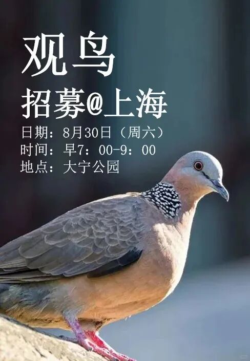 大宁公园,是浦西中心城区面积最大的公园。公园定位为“生态景观型城市公共绿地”,以叠山理水、营造自然山水为构架,配置丰富多彩的乔木、灌木、草坪和地被植物,并因地制宜建设一些湿地,形成稳定的植物群落和生态自然景观。是上海浦西最大的公园,也是上海2000年代初排名第二的特大型公共绿地。本次观鸟活动观察目标包含上海市常见野生鸟类,适合初学者前来体验。