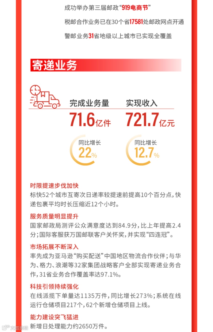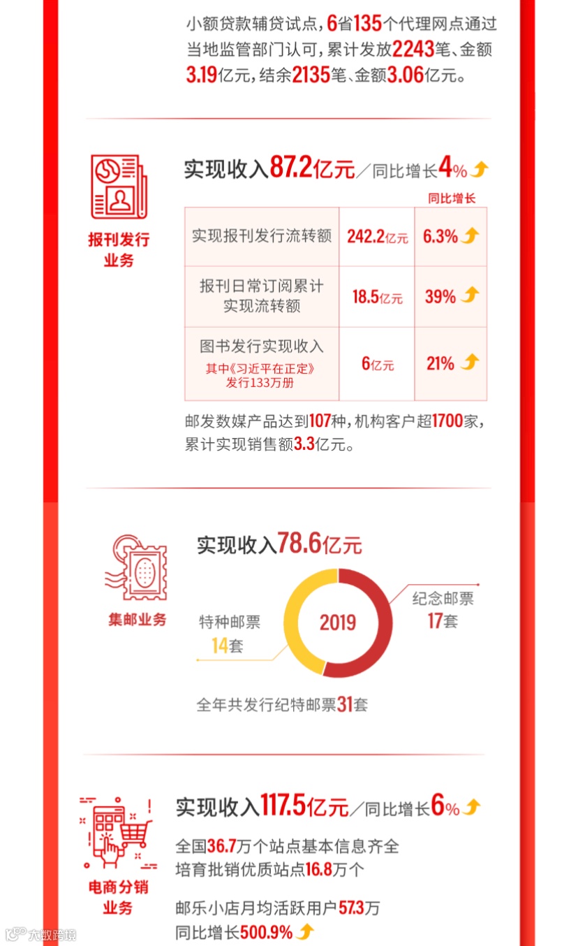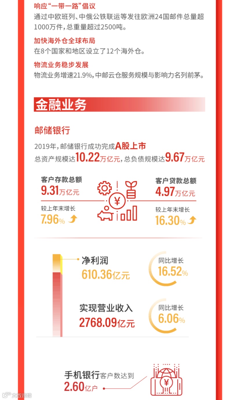 经过多年来的改革创新、转型升级,中国邮政目前已经从传统邮政企业发展成为履行普遍服务和特殊服务义务,经营邮政基础性业务、金融业务、快递物流业务和电子商务的多业态融合的现代企业集团,拥有通达全球、覆盖城乡的邮政网络,遍布全国各地、深入千家万户的营业网点,便民利民惠民的综合服务平台和电子商务平台,着力承担着行业“国家队”责任,在推动经济社会高质量发展,满足人民群众美好生活需要中发挥着重要作用。2019年经国务院批准,中国邮政集团公司正式改制为中国邮政集团有限公司。