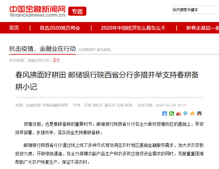 中国邮政储蓄银行在做好疫情防控的同时,积极通过线上线下多种方式有效满足农村地区基础金融服务需求,加大涉农贷款投放力度,开辟绿色通道,全力保障农副产品生产和春耕备耕农资供应信贷资金需求,连日来中央广播电视总台等多家媒体关注并进行报道。