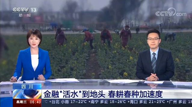 2月25日,央视新闻频道《朝闻天下》播出《金融“活水”到地头 春耕春种加速度》,报道了邮储银行四川省德阳市旌阳区支行启动“绿色通道”,资金支持“三农”客户春耕春种。
