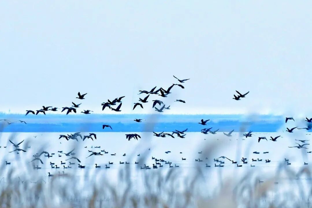 每至初冬,数十万羽候鸟从西伯利亚等地不远万里如约而至,使这里成为世界候鸟的最大越冬栖息地。这些空中精灵自由翱翔、叠霜弄影,呈现出“飞时遮尽云和月,落时不见湖边草”的奇观,使人情醉神迷。