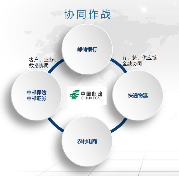 对中国邮政来说,银行与保险、证券存在着客户协同、业务协同、数据协同等诸多协同;银行与物流存在着存、贷、供应链金融协同;银行与农村电商有着更多的协同。