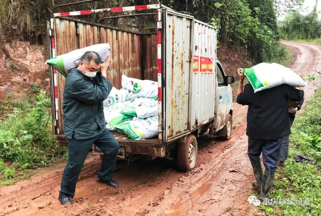 ▲下雨天药材基地路面泥泞,知道丁茂强的货车开不进来,陈老板早早便带着几名工人等在路口。待车子停稳,大家你一袋我一袋,帮着丁茂强卸货,用肩和背篓载着“希望”,深一脚浅一脚地直奔种植基地……