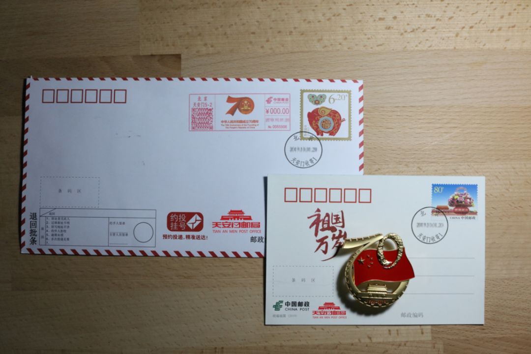 正品纪念徽章+中国邮政国版明信片+定时寄《祝福祖国》挂号信