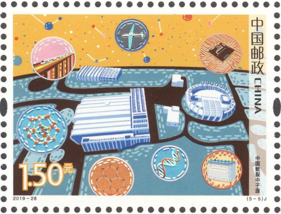 邮票设计采用手绘插画的表现手法,构图简洁明快,色彩组合对比浓烈,视觉风格鲜明,具有一定的超现实感。第一图表现探月工程“嫦娥四号”着陆器、“玉兔二号”巡视器、“鹊桥”中继星等;第二图表现了于2017年11月27日、12月5日诞生的两只克隆猴“中中”和“华华”;第三图以高速公路寓意同时具备铁磁性、体绝缘性、拓扑非平庸性的磁性掺杂拓扑绝缘体薄膜,配合能带图,展现电子在拓扑绝缘体薄膜中高效运动的情景;第四图通过表现大脑、肠道等人体内环境,以及海藻、药物胶囊、化学结构式等图案,体现出GV-971新颖的药物作用模式与独特的多靶作用特征;第五图描绘了强流质子直线加速器、快循环同步加速器、靶站的外部造型,悬浮在空中的圆形球体表示散裂中子源在材料科学、物理学、生命科学、新能源等领域的广泛应用和广阔前景。