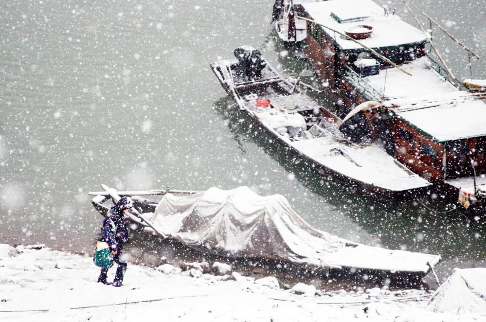 严冬飘雪,渔船休憩,万籁俱静,唯有邮政人默默前行。