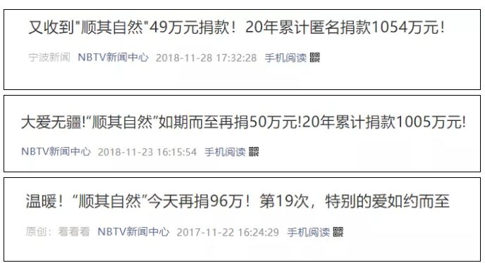 2001年12月3日,从白鹤邮局汇出15万元,落款“顺其自然”,地址:甬江南路1号。资助2002年100名在校特困大学生。