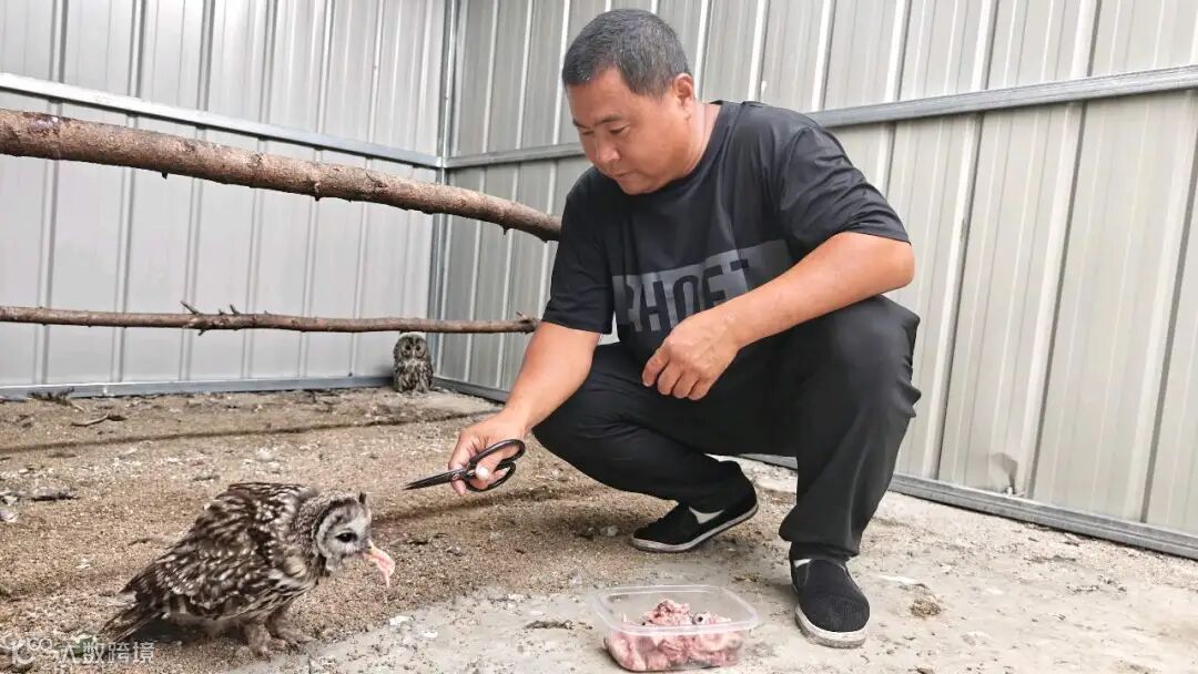 残障长尾林鸮笼舍喂食