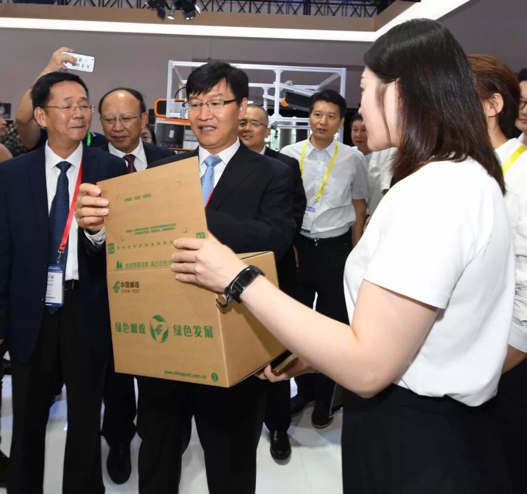 交通运输部副部长刘小明走进邮政展区,兴致勃勃地拿起一个邮政绿色包装箱问:“这是可以重复使用的包装吗,你们已经开始使用这种包装了吗,绿色包装可以重复使用几次?”“这种包装采用可降解材料制成,可以反复利用,目前我们已经在全国大力推广使用。”得到满意的回答后,刘小明又走到邮政无人机前,饶有兴致地向工作人员询问了邮政无人机的投放范围和投递量。