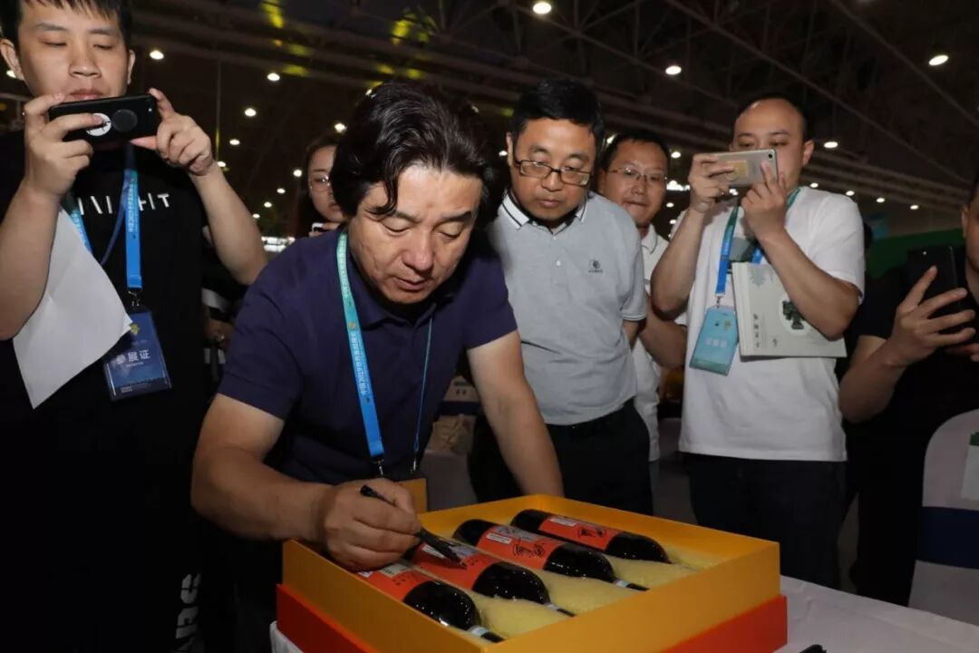 ▲邮票设计家王虎鸣在邮票文化酒上签名留念