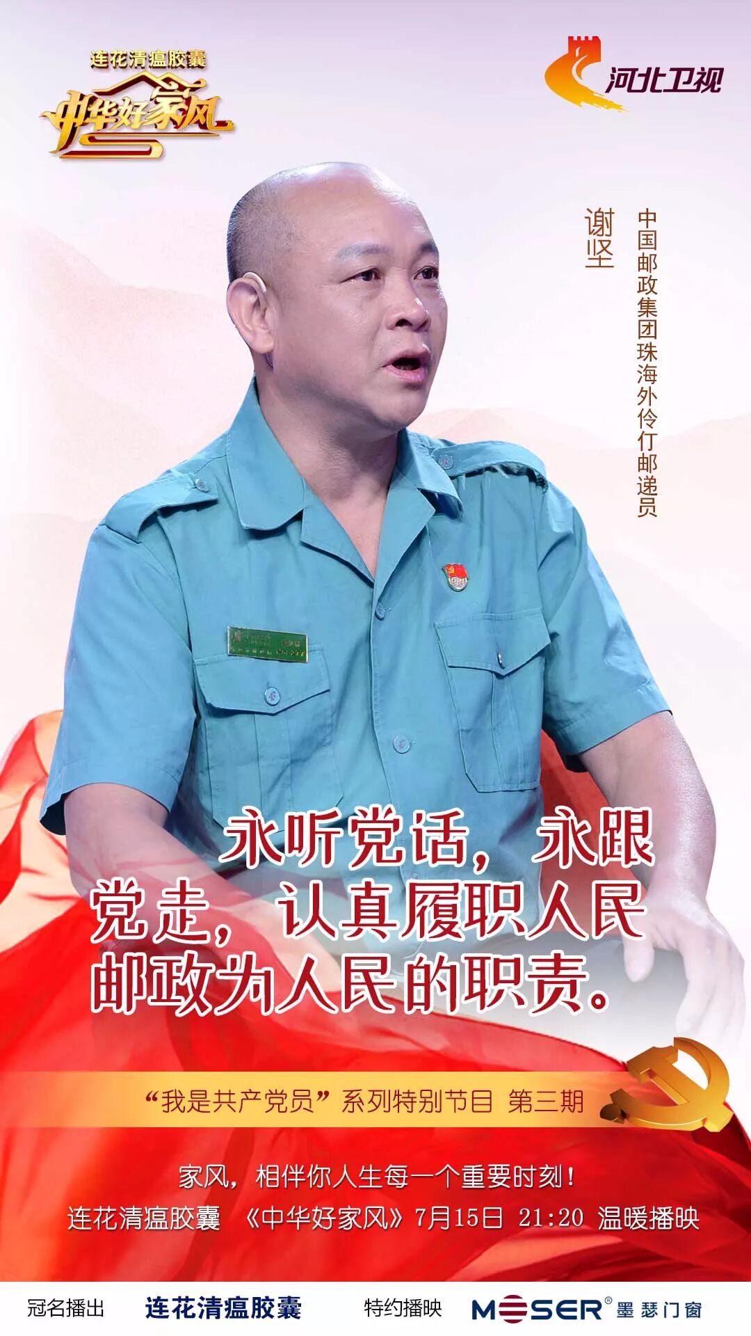 谢坚是第十三届全国人大代表,夫妻同为中国邮政集团公司珠海市分公司外伶仃邮政营业所员工。1988年谢坚从部队退役被安排到珠海市外伶仃邮政营业所工作,1998年与海岛姑娘蔡丽妆结为夫妻,育有大女儿与一对双胞胎女儿。夫妻二人坚守海岛三十多年,坚持为海岛党政军民提供优质的邮政服务,一起见证珠海外伶仃岛的变化与发展。是邮政企业文明家庭、奉献社会的典型代表。2019年,谢坚夫妇被推选为“全国最美家庭”。