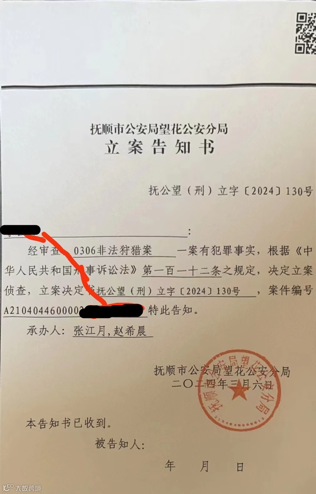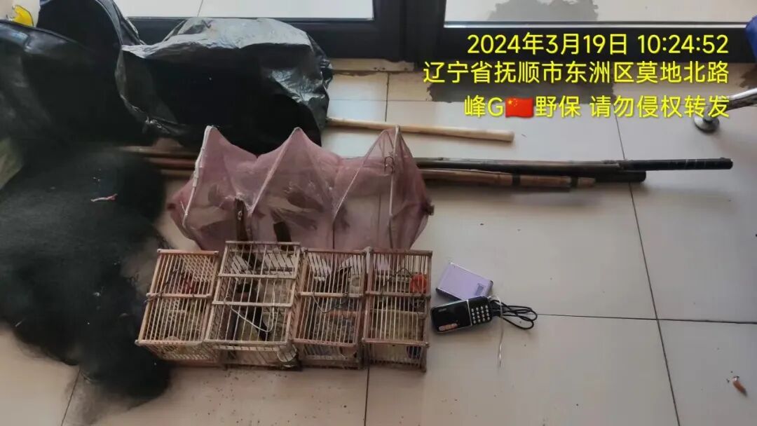 凌晨4点在辽宁省抚顺市望花区巡护,发现2处捕猎场,于是将情况反映给相关部门。执法部门到达现场后,将捕鸟者当场控制,随后在其家中查获鸟类死体103只(后已无害化掩埋处理),包括田鵐102只、锡嘴雀1只。此外,志愿者从2处捕猎场的捕鸟网上以及捕鸟者家中解救野生鸟类共11只,包括田鵐8只、燕雀1只、北朱雀1只、锡嘴雀1只,拆除3片捕鸟网。目前2名捕鸟者已被立案调查,经鉴定并检查,符合野放条件的鸟儿均回归大自然。