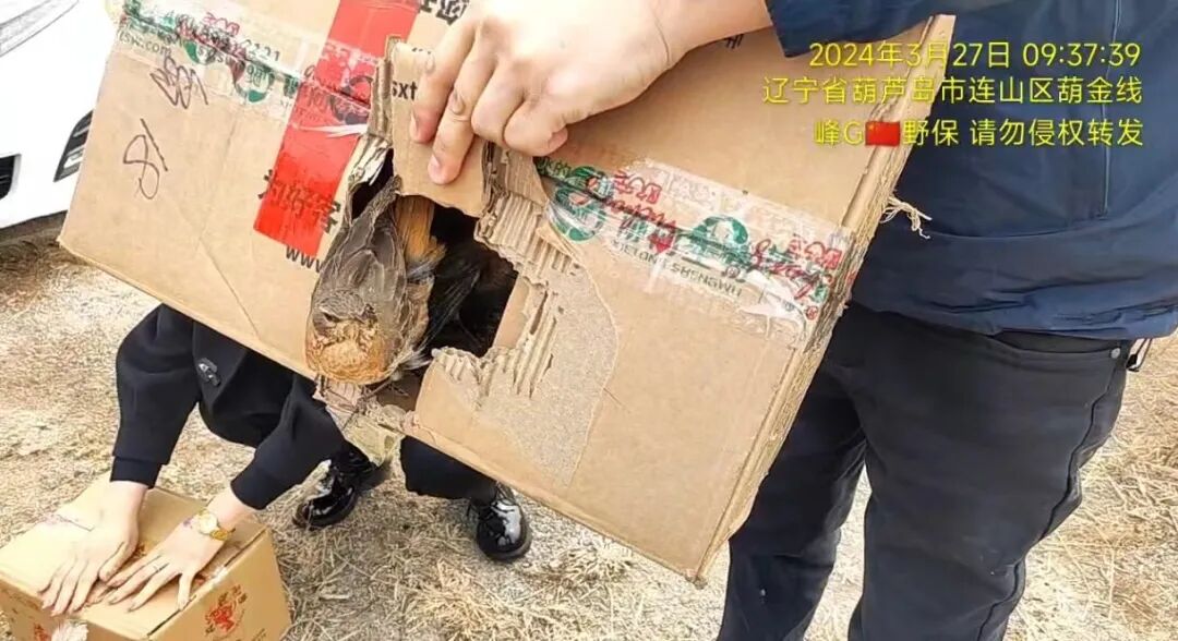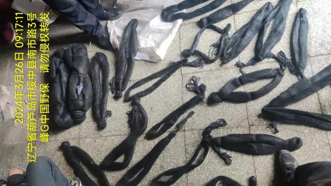 在辽宁省葫芦岛市绥中县巡护,协助执法部门打击2处非法贩卖野生鸟类和捕猎工具的窝点,查缴6个打笼以及200余张网,解救野生鸟类共103只,包括蜡嘴雀10只、黄雀55只、交嘴雀1只、普通朱雀6只、煤山雀31只。嫌疑人已被执法部门带走作进一步调查,经鉴定和检查,符合野放条件的鸟儿均回归自然。