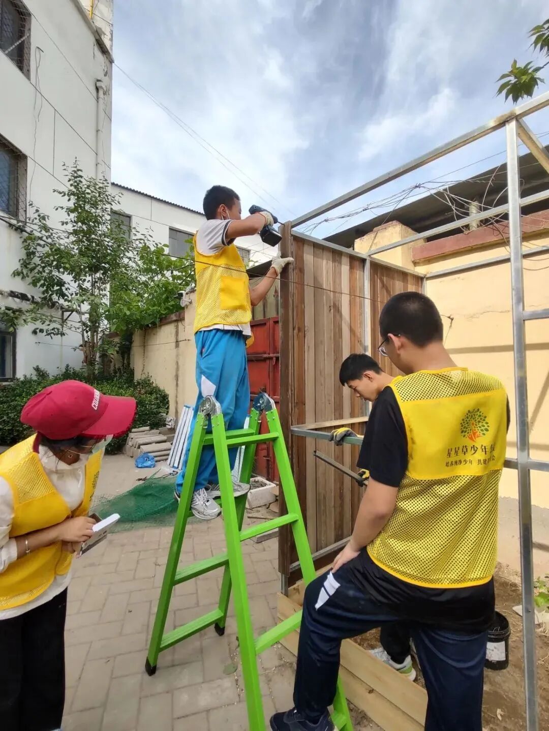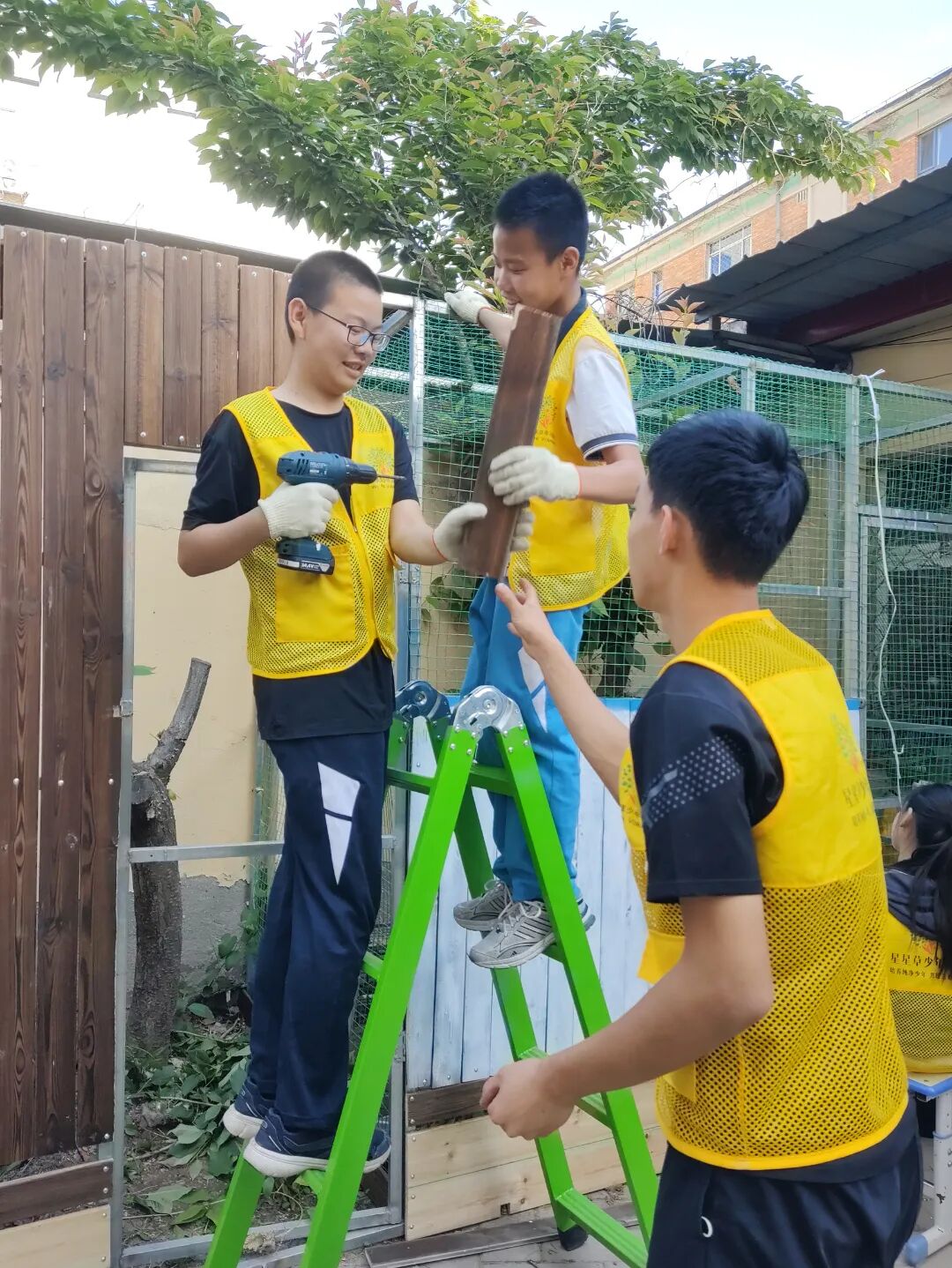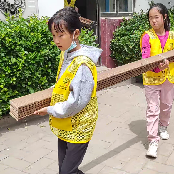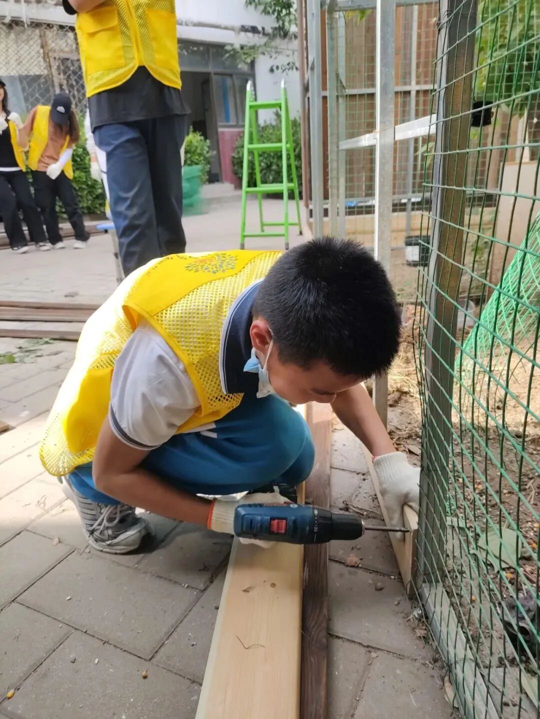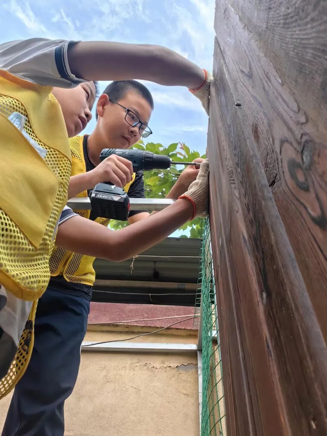 孩子们天生热爱动手实践与团队协作。整个下午,三位半大小伙子在干中学,不断尝试、实施、讨论、协作,从最初的不会使用电钻逐渐成长为手法娴熟的施工达人。负责喷环保漆的小志愿者们同样表现出色,他们在做好简单防护后,便迅速投入到工作中,展现出毫不娇气的精神风貌。