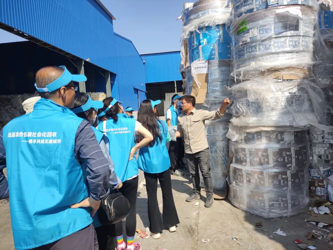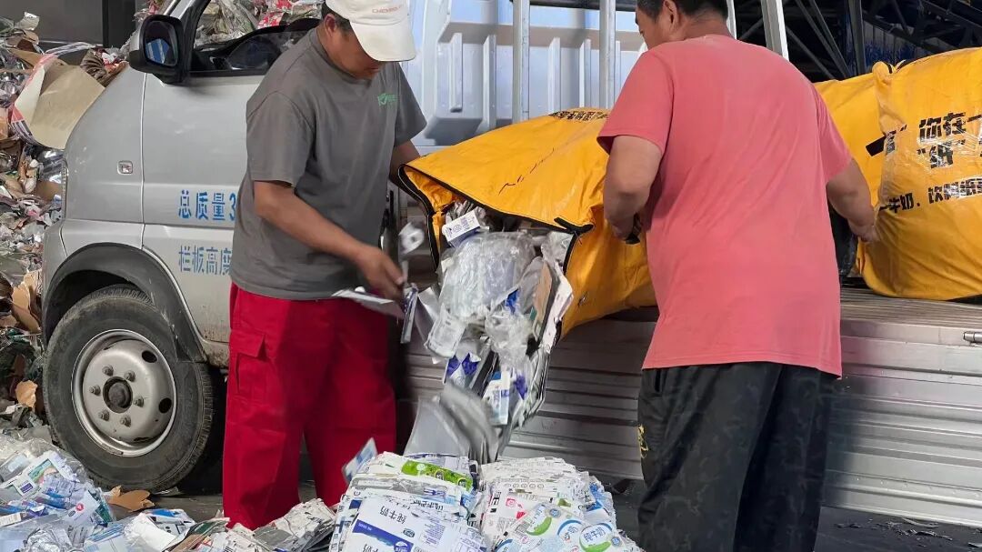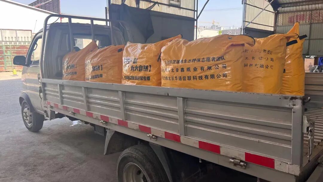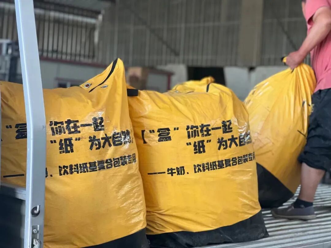 白洋淀湿地生态野保志愿者团队将收集的废弃牛奶盒(纸基复合包装)运往普鑫纸业有限公司进行回收加工。
