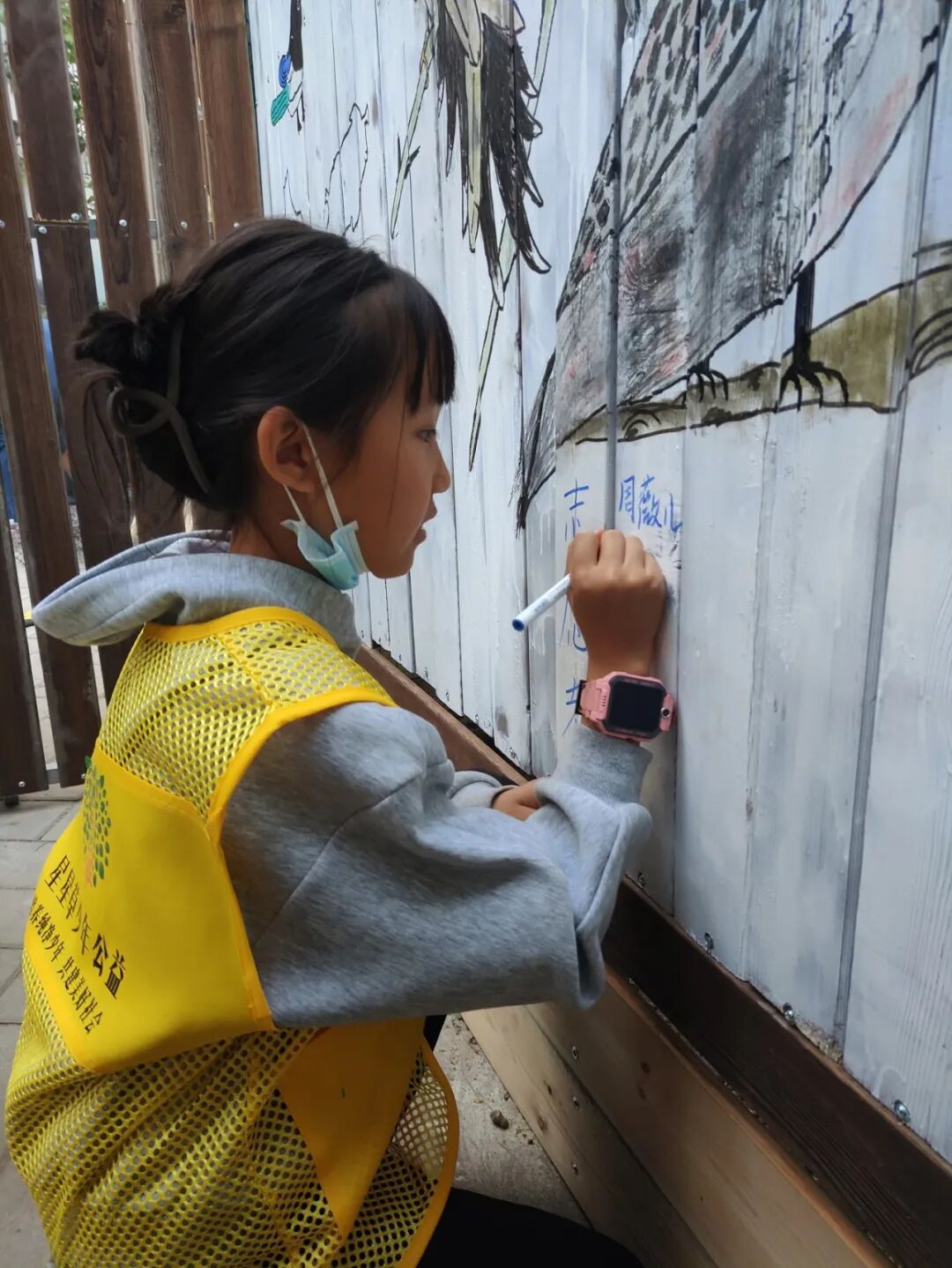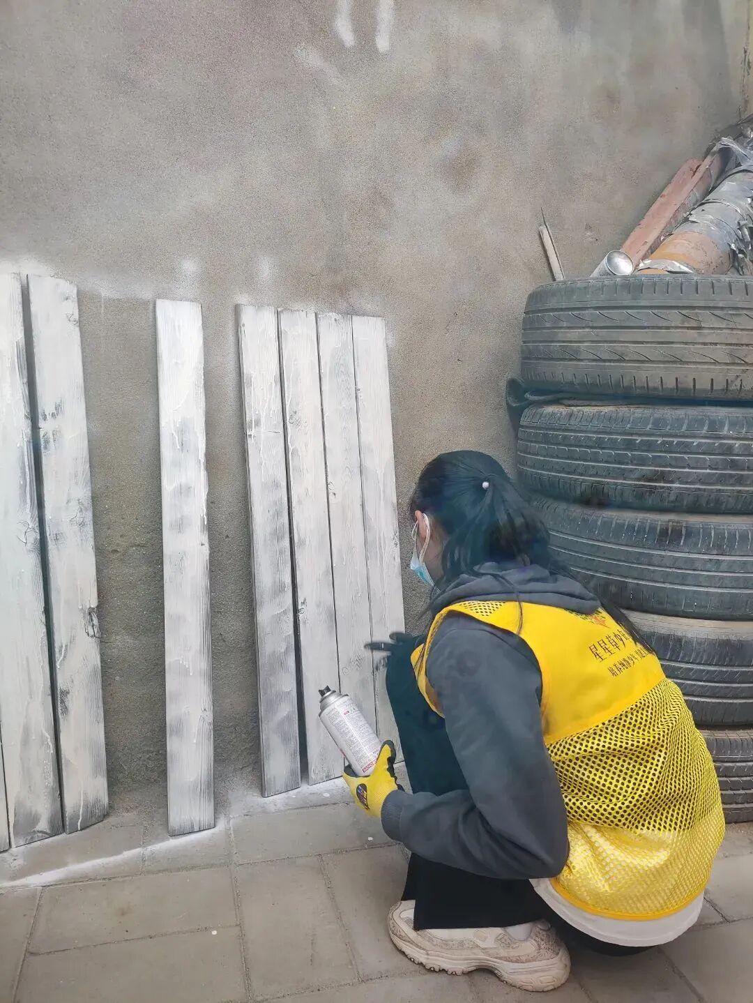 两位小学生志愿者中,有一位晕车+感冒,身体有些不舒服,但仍然帮着一起干活,并坚持完成了围栏彩绘底稿工作。做完自己工作的初中姐姐也来参与彩绘工作。