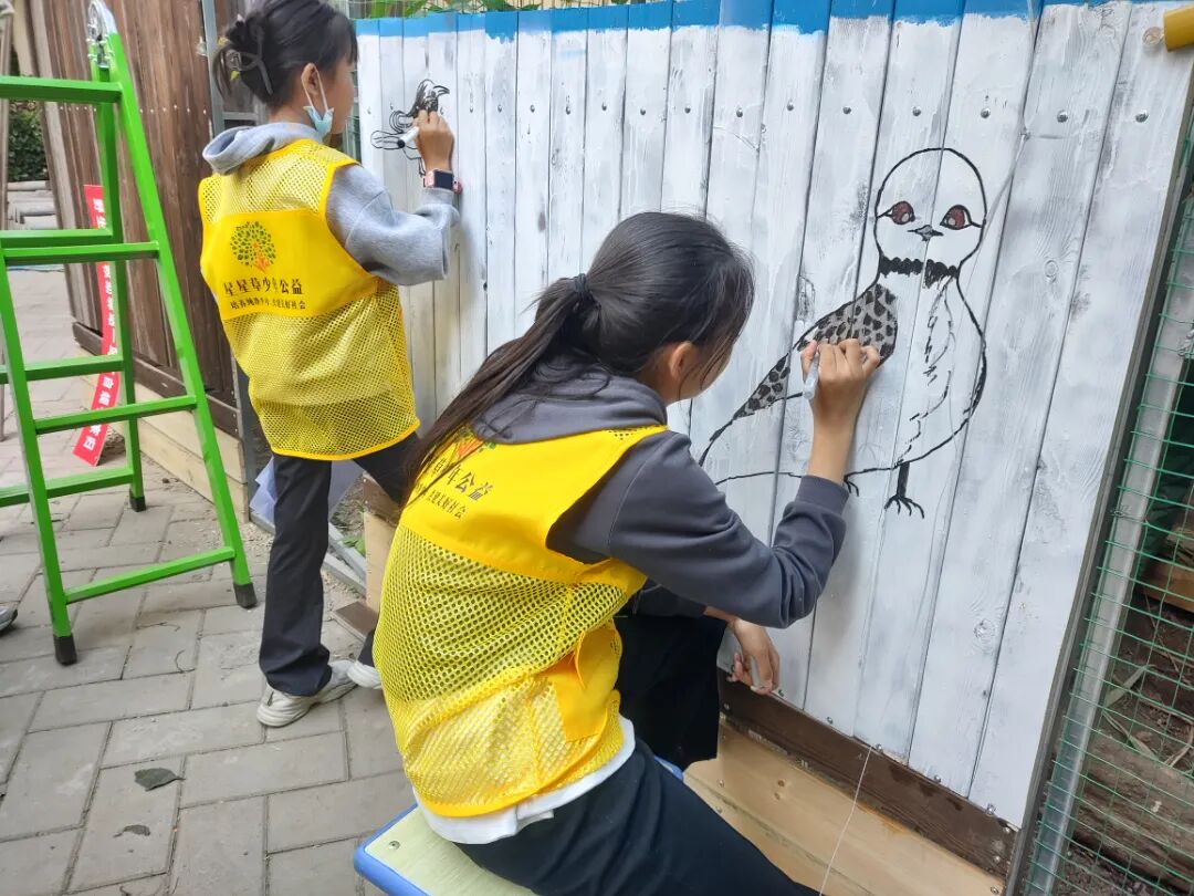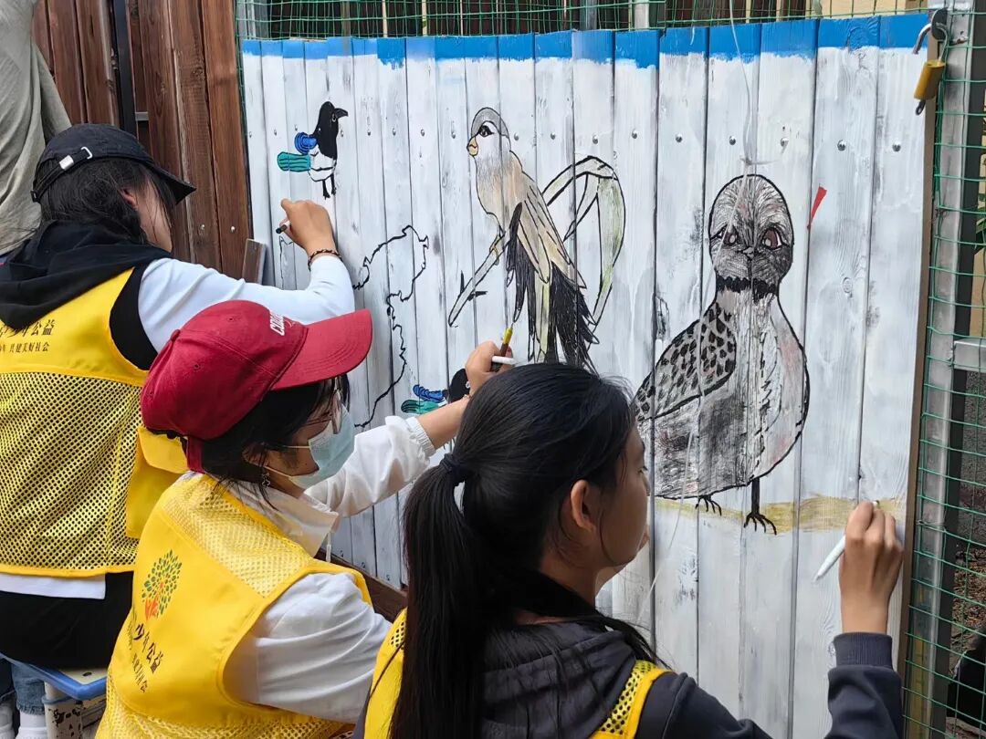 那一边,男孩子们忙着给猛禽笼舍安装围栏;这一边,女孩子们开始在已安装完成的通用鸟舍围栏上彩绘。