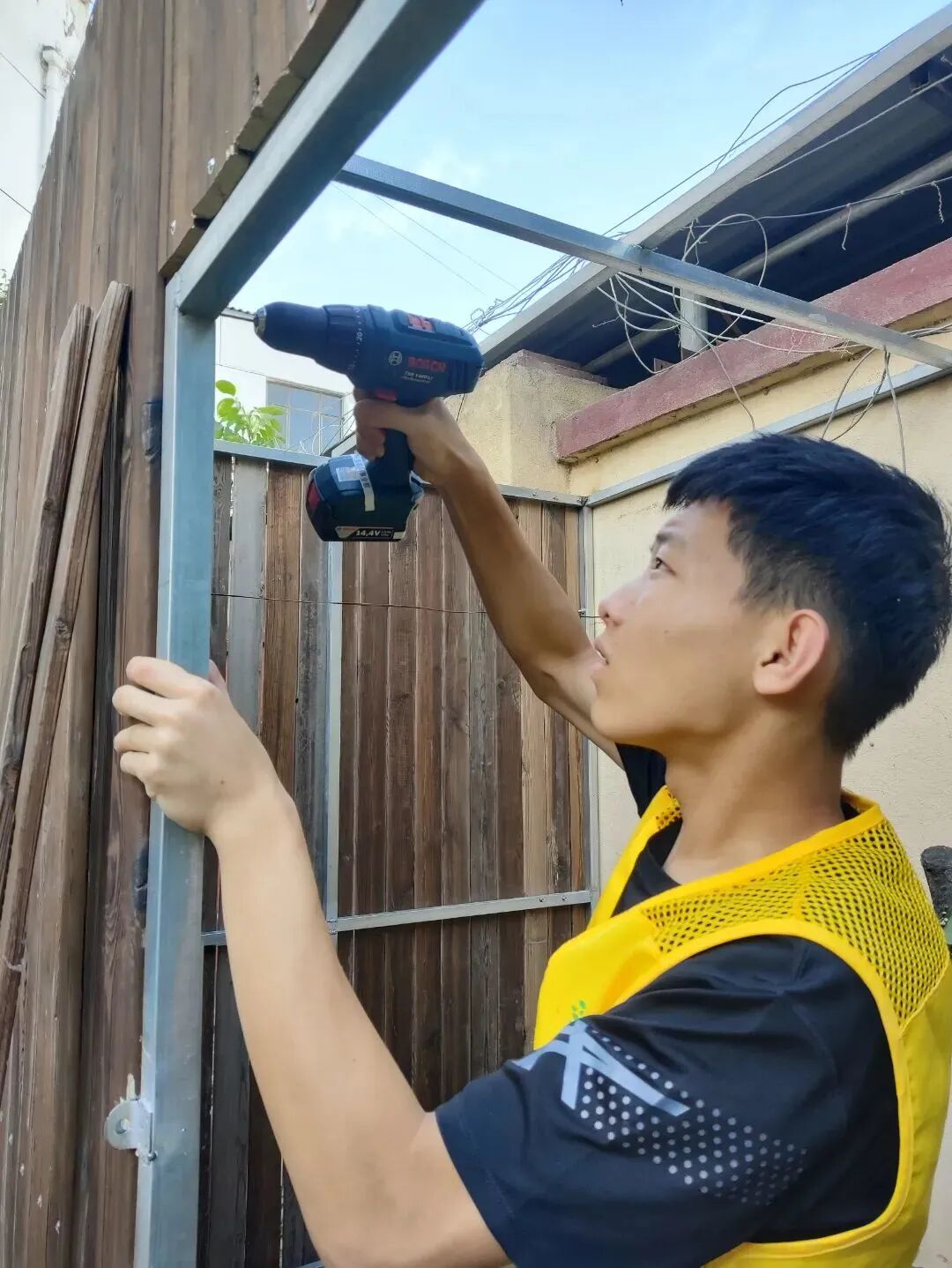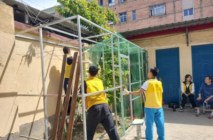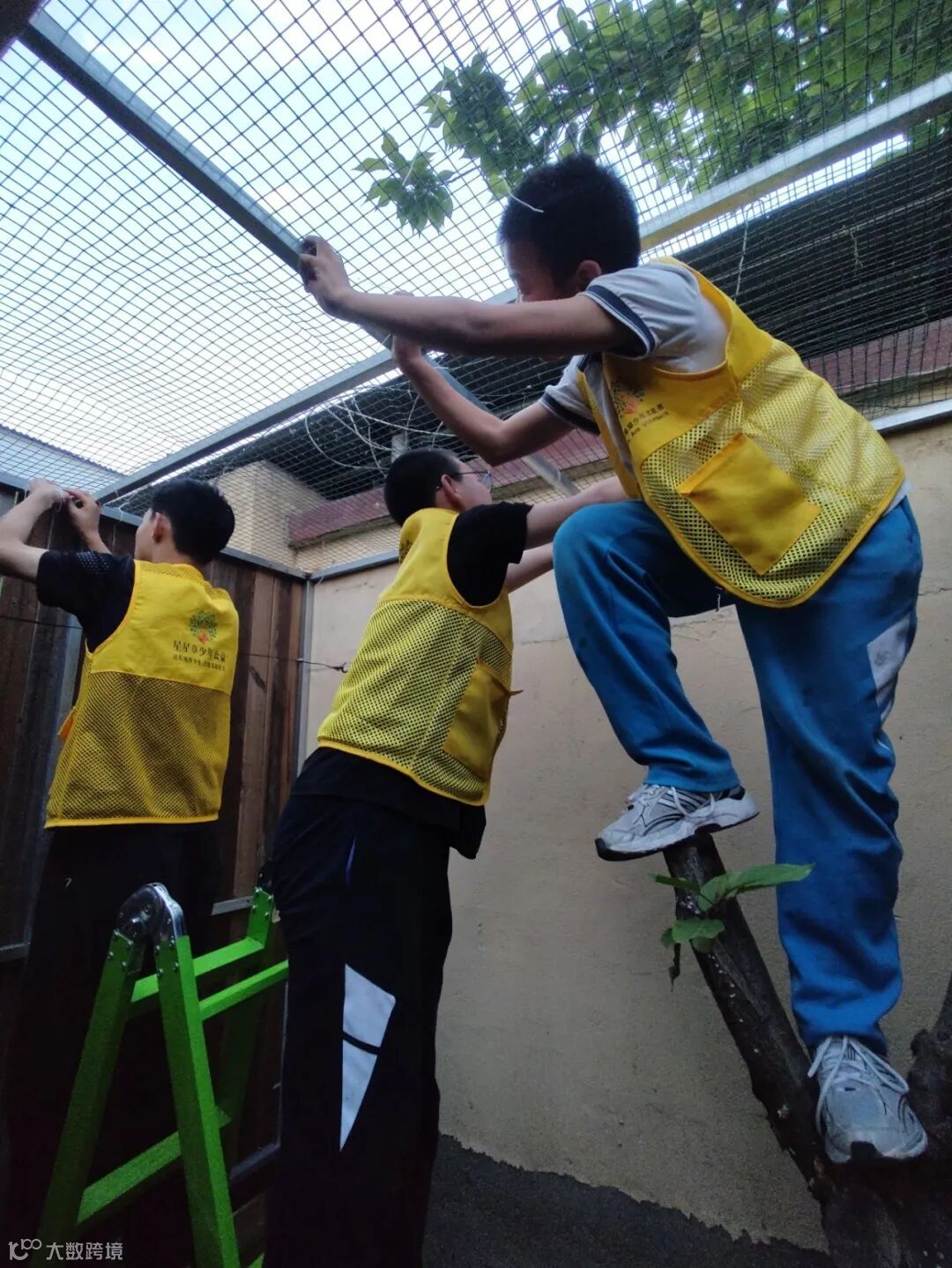 三位初中小伙子作为建设的主力军,他们负责拆除猛禽鸟舍原有的三面铁丝围栏(其中一面为墙体),并安装全新的全高垂直木板条(碳化木)围挡。对于紧挨着的通用鸟舍,则安装半高垂直木板条围挡,并搭建网状屋顶。两位小学生志愿者则负责围栏的彩绘工作,为环境增添色彩与活力。其他志愿者则承担木条割锯、喷环保漆以及协助施工等任务,确保整个项目的顺利进行。