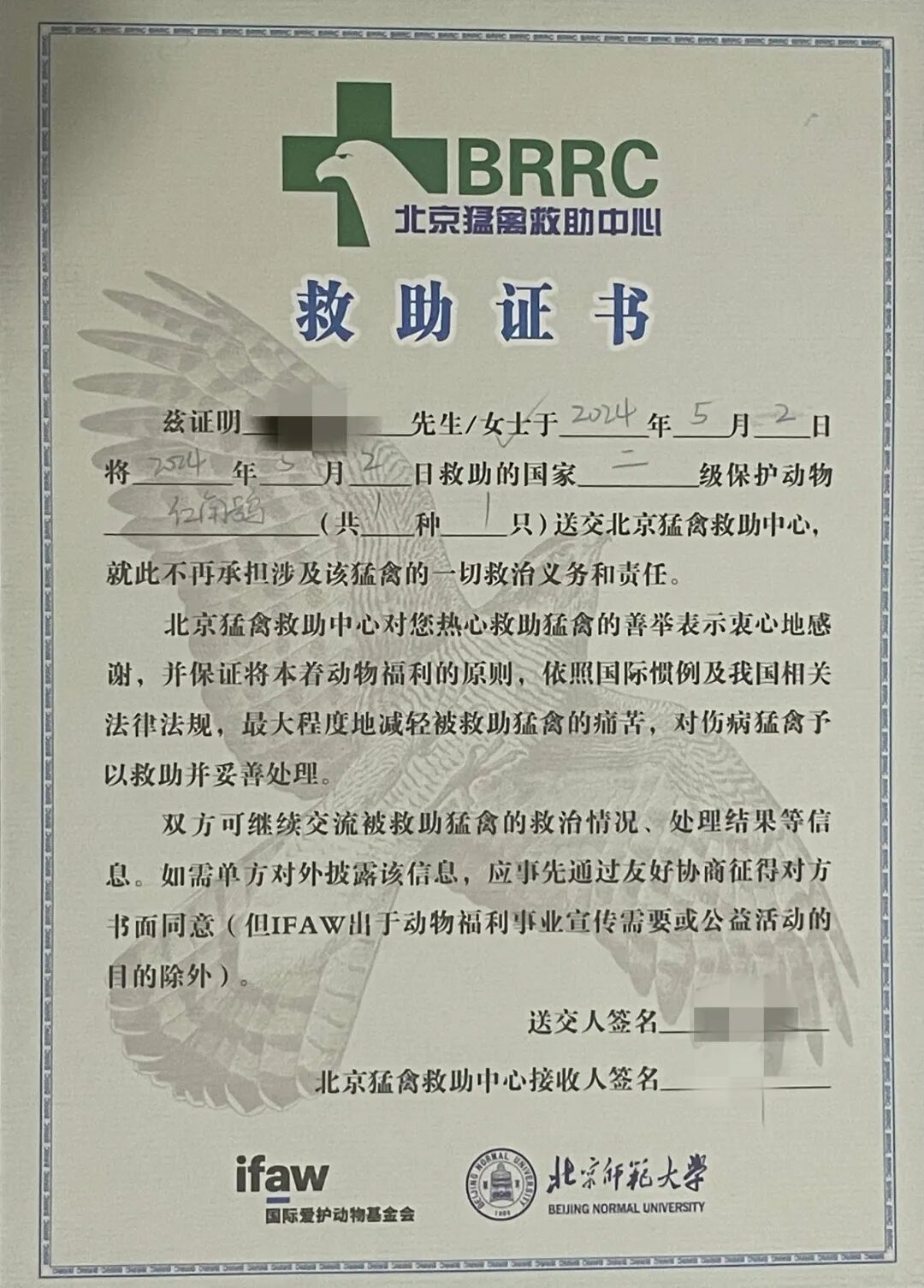 中午由救助站接上红角鸮,携带上任丘市自然资源和规划局开具的野生鸟类救助运输证明,下午5:00活动结束后启程返京。