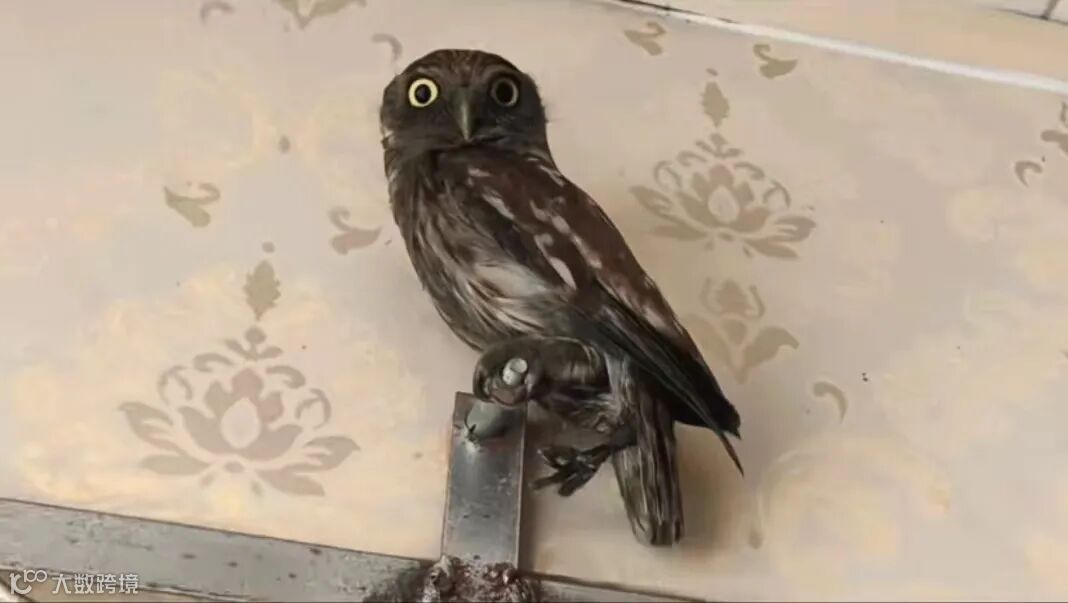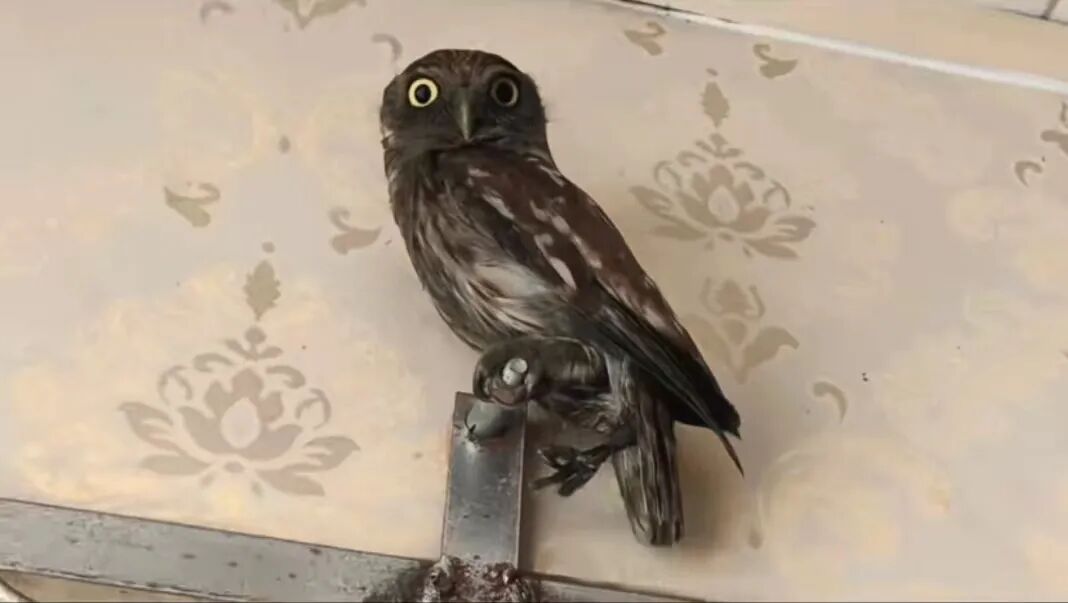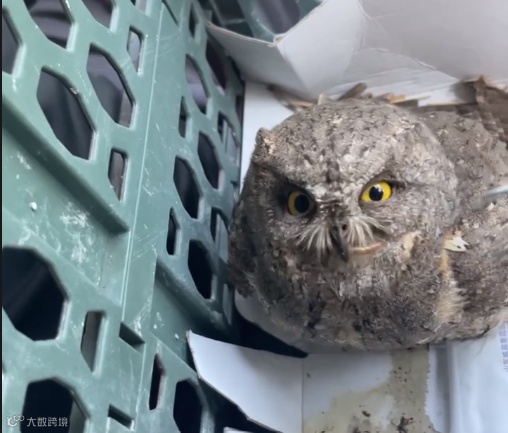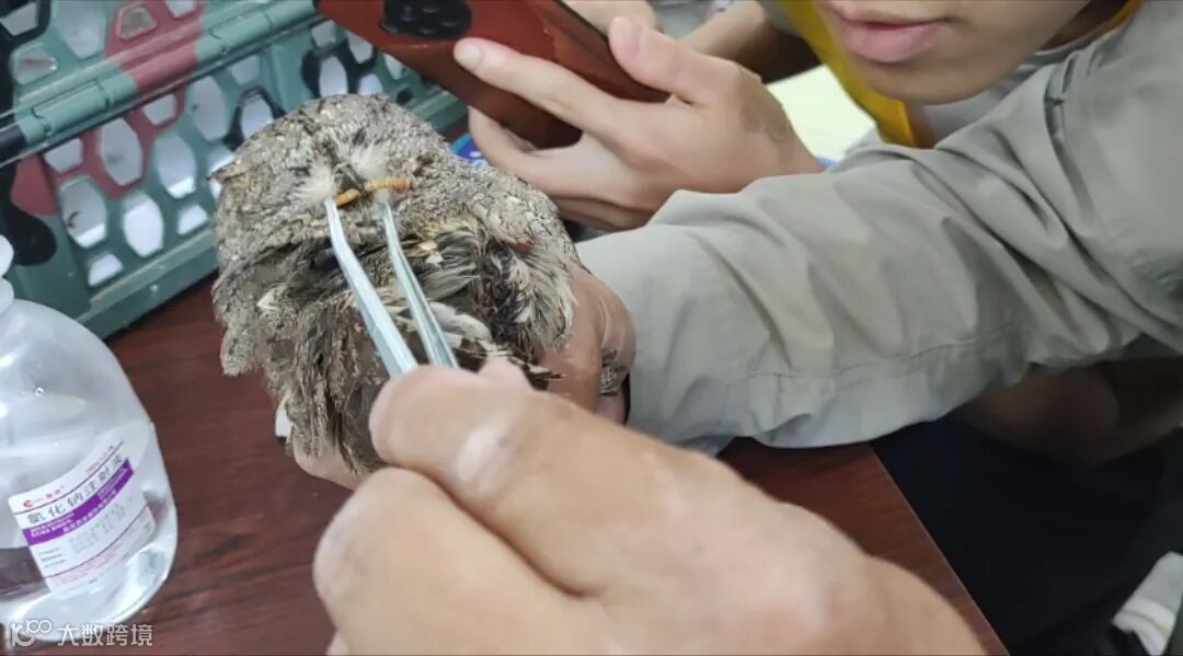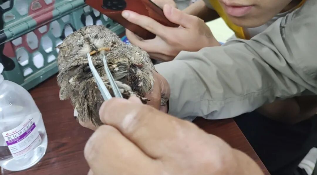 救助站里还有一只纵纹腹小鸮,因脚趾被塑料线缠住而受困于油污,导致右腿坏死。