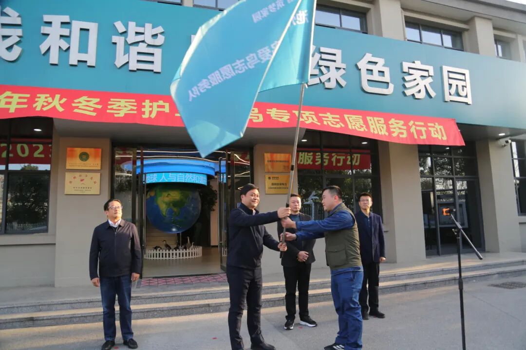 池州市副市长何刚为国网池州供电公司“鸟线和谐·筑梦家园”护线爱鸟志愿服务队授旗