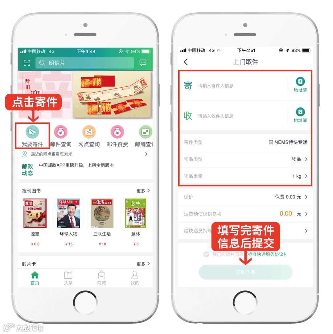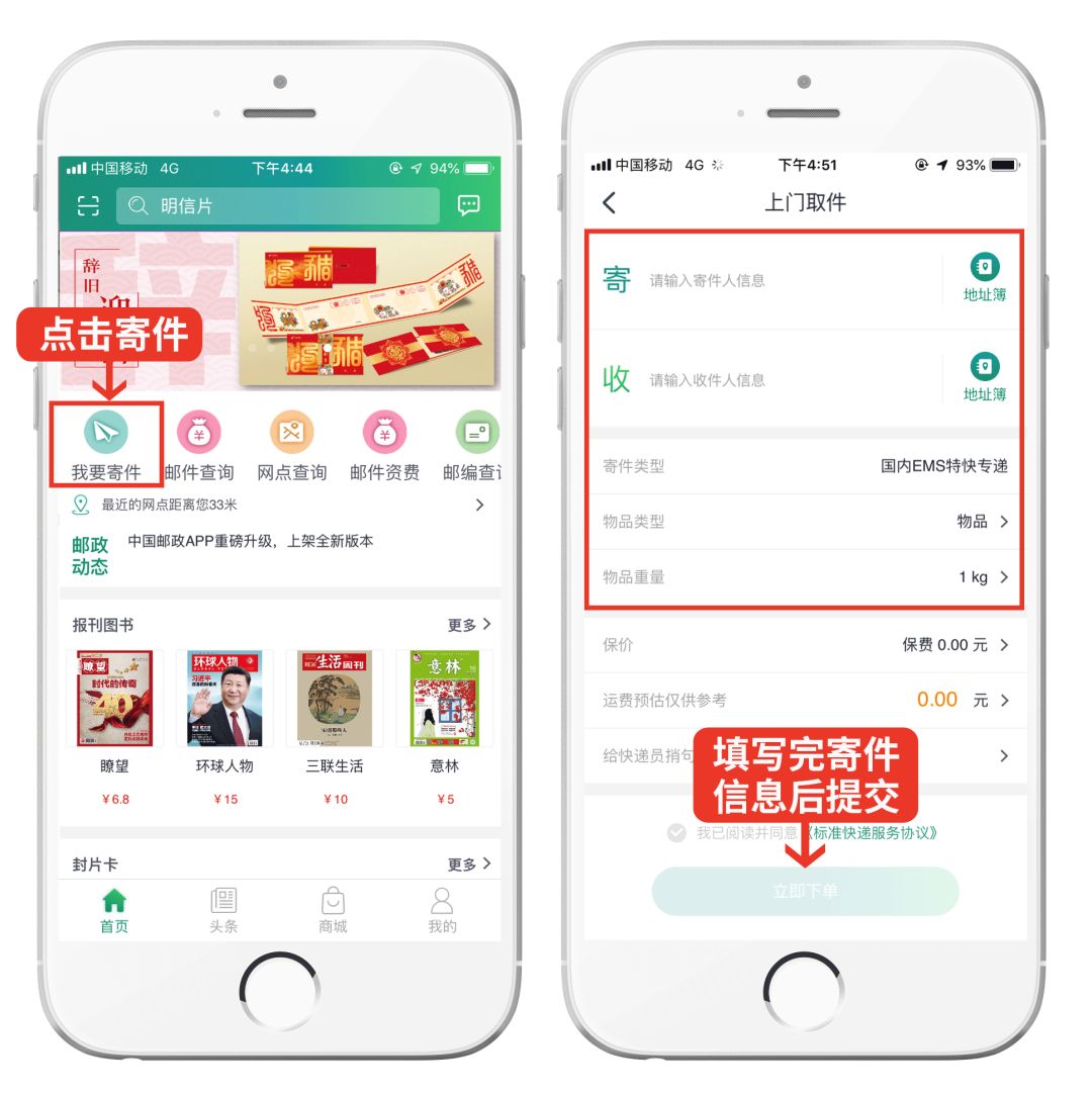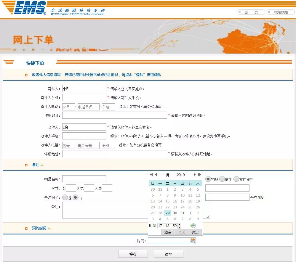 填写寄、收件人真实姓名、电话、地址,物品名称,上门收件时间并提交即为下单成功。