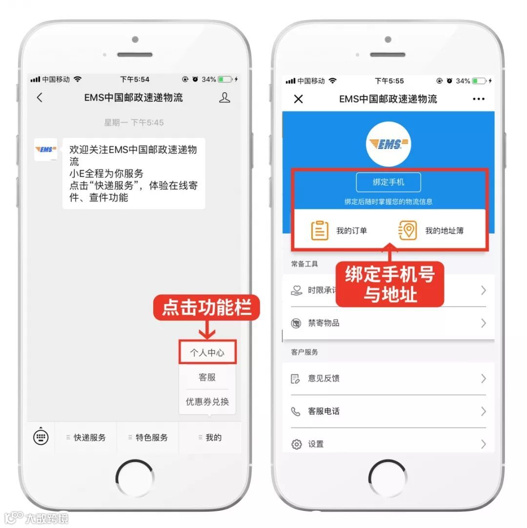 自助预约 :电话接通后,按「1」号键即可使用常用地址快捷下单。自助预约前,需关注公众号「EMS中国邮政速递物流」,点击菜单栏「我的」-「个人中心」绑定手机号+常用地址。
