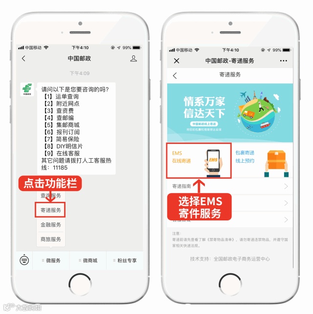 关注后,点击菜单栏「微服务」-「寄递服务」,选择EMS在线寄递。