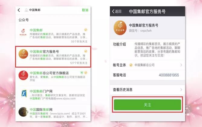 在微信公众号中搜索“中国集邮”,点击“中国集邮官方服务号”,点击关注。