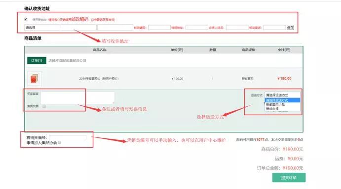 选择商品后,填写收件地址,进入确认订单页面。需要注意的是,不管选择寄递还是自提,都需要填写收件地址。营销员编号、发票、留言和是否需要成为集邮会员可以根据个人意愿填写。点击提交订单即可生成订单。