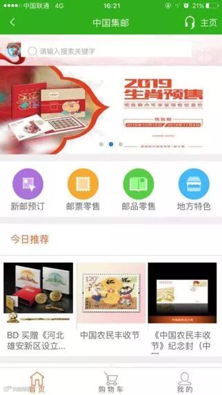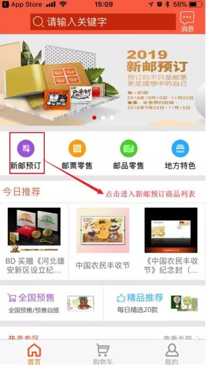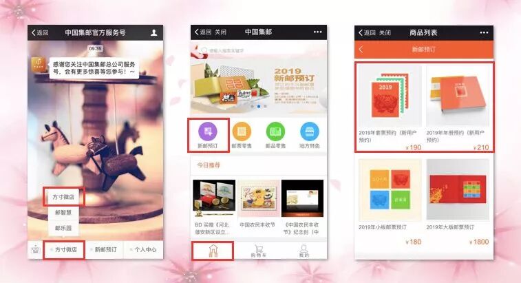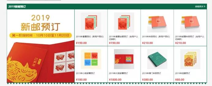 首页“新邮预订”分类入口和“2019年新邮预订”橱窗均可以选择商品。新用户可选择“2019年年册预约(新用户预约)”、“2019年套票预约(新用户预约)”两款商品。