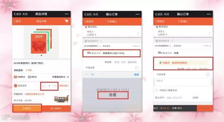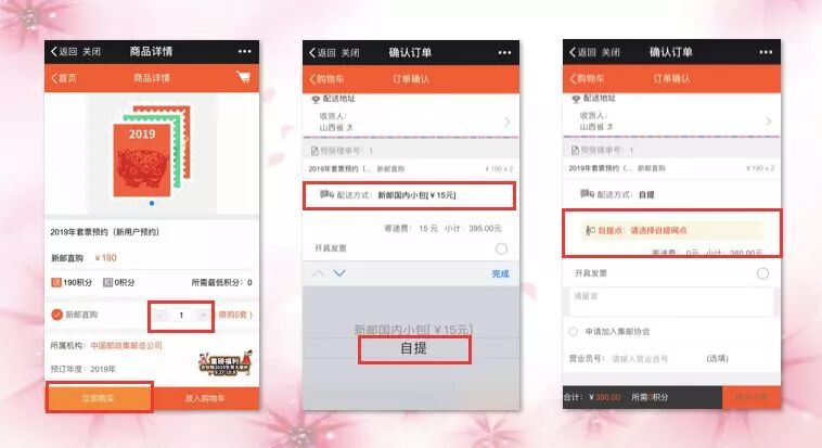 选择商品后进入确认订单页面。需要注意的是,不管选择寄递还是自提,都需要填写收件地址。营销员编号、发票、留言和是否需要成为集邮会员可以根据个人需要填写。点击提交订单即可生成订单。