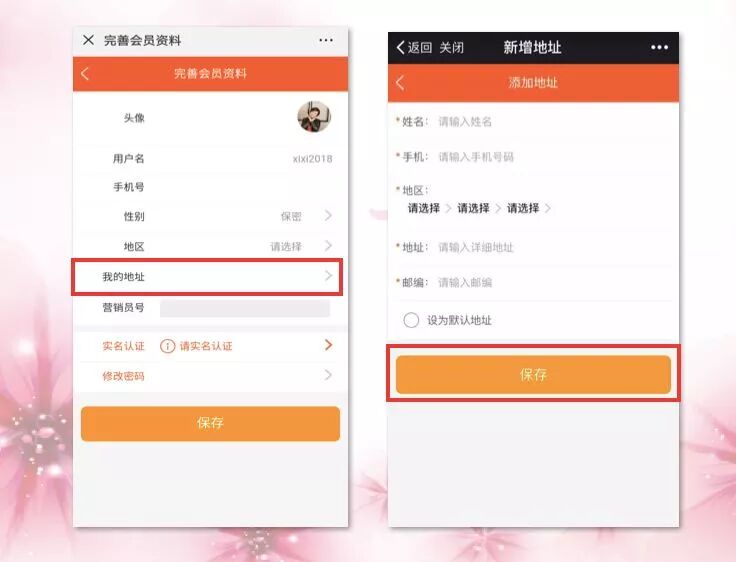 继续点击“我的”,点击“头像”,点击“我的地址”,根据提示输入个人信息(自提也需要输入地址才可以完成订单)。